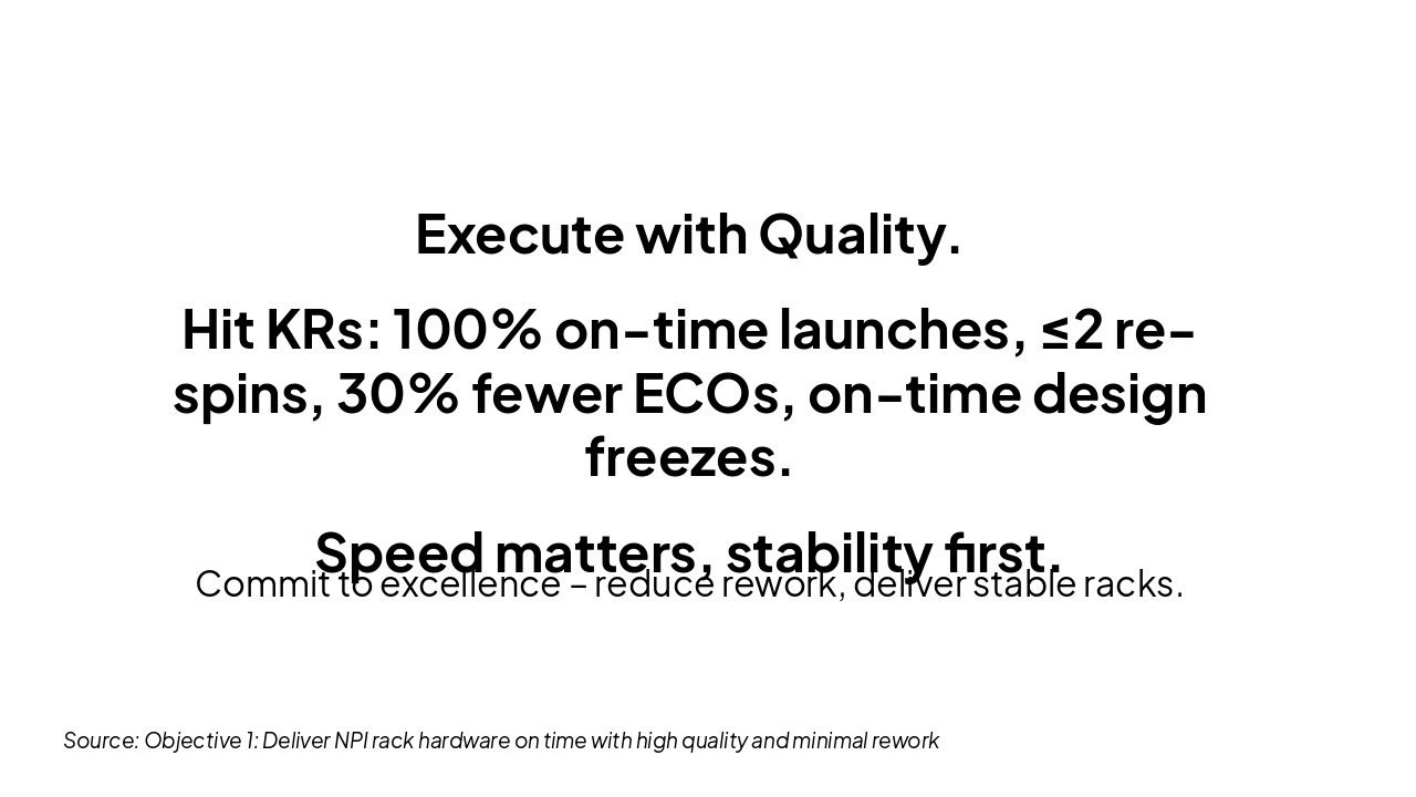 The slide presents Objective 1, focused on delivering on-time, high-quality NPI rack hardware. It emphasizes minimizing rework by prioritizing stability over speed.