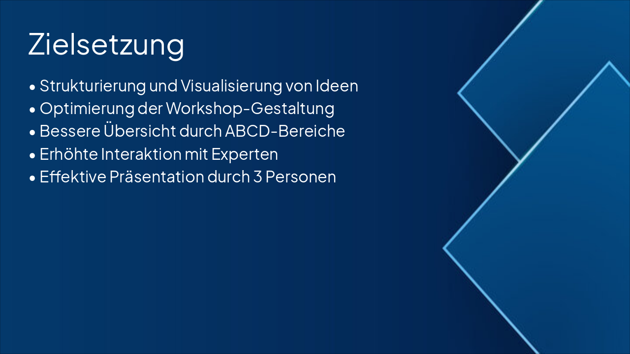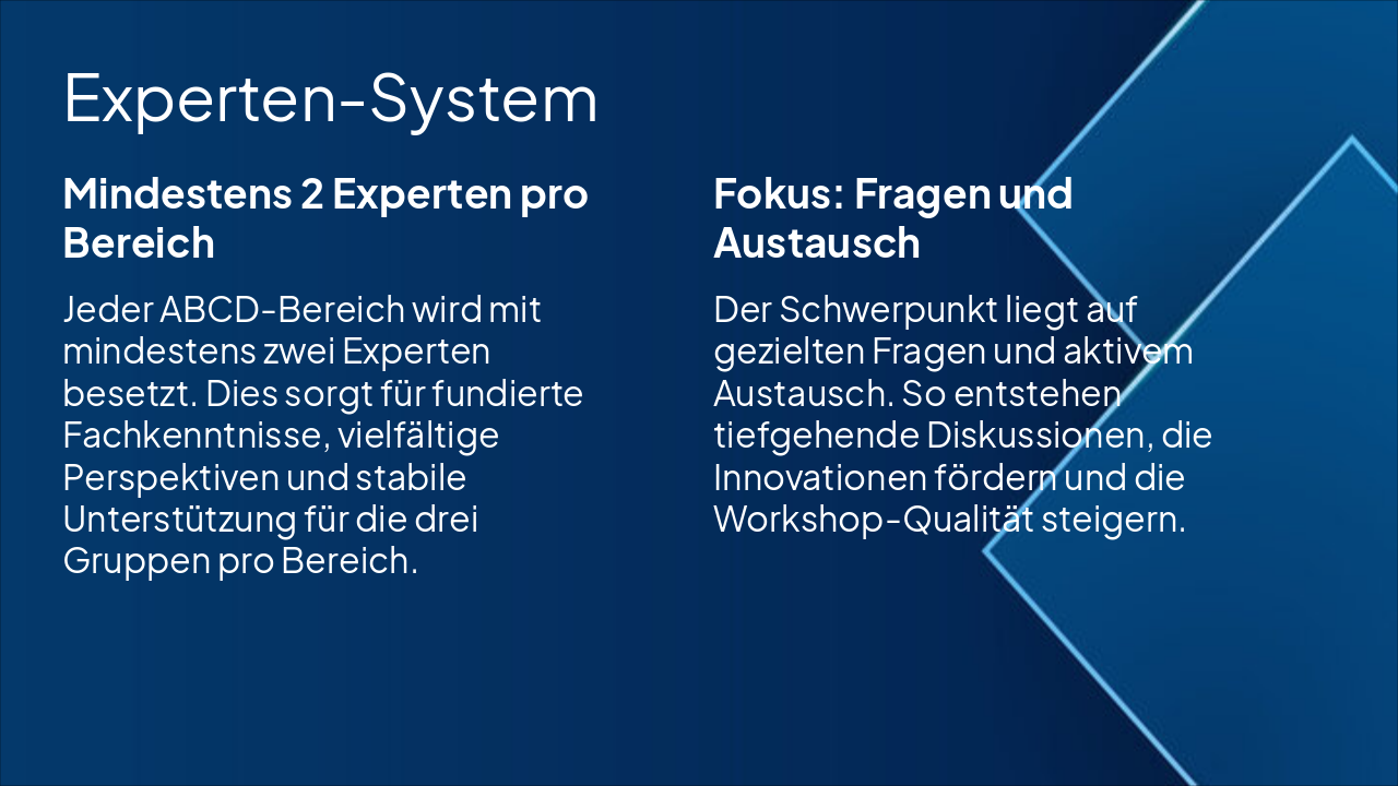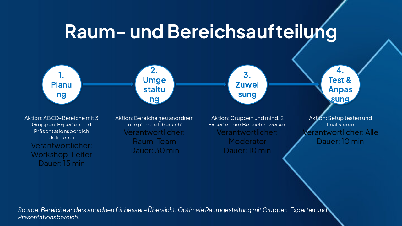 { "headers": [ "Schritt", "Aktion", "Verantwortlicher", "Dauer" ], "rows": [ [ "1. Planung", "ABCD-Bereiche mit 3 Gruppen, Experten und Präsentationsbereich definieren", "Workshop-Leiter", "15 min" ], [ "2. Umgestaltung", "Bereiche neu anordnen für optimale Übersicht", "Raum-Team", "30 min" ], [ "3. Zuweisung", "Gruppen und mind. 2 Experten pro Bereich zuweisen", "Moderator", "10 min" ], [ "4. Test & Anpassung", "Setup testen und finalisieren", "Alle", "10 min" ] ] }