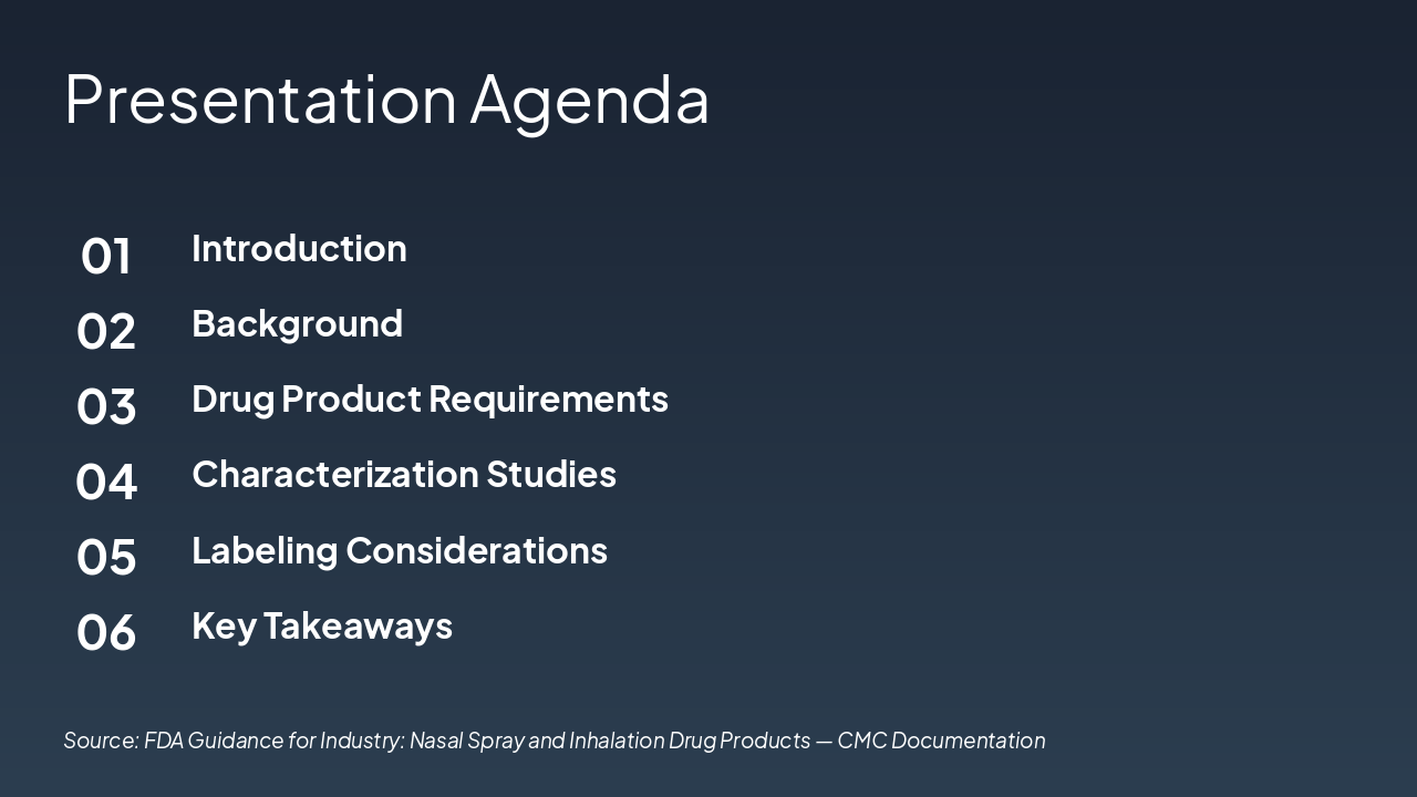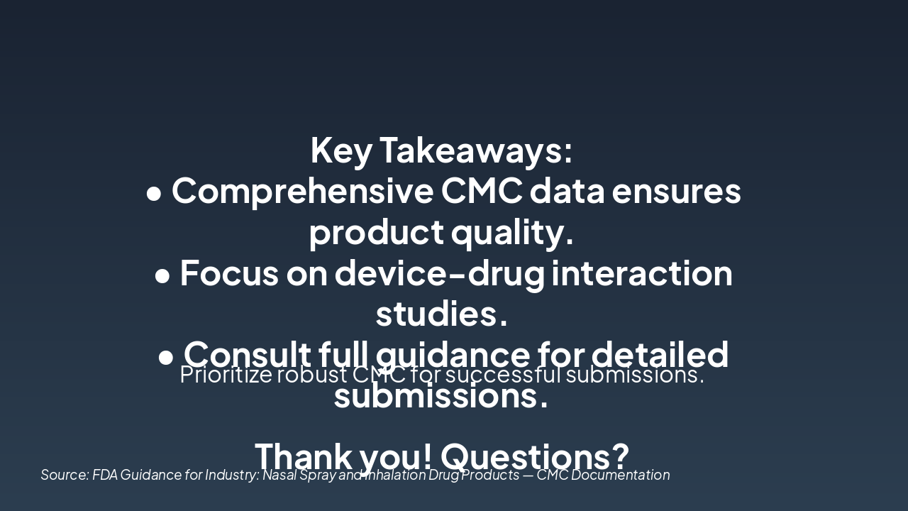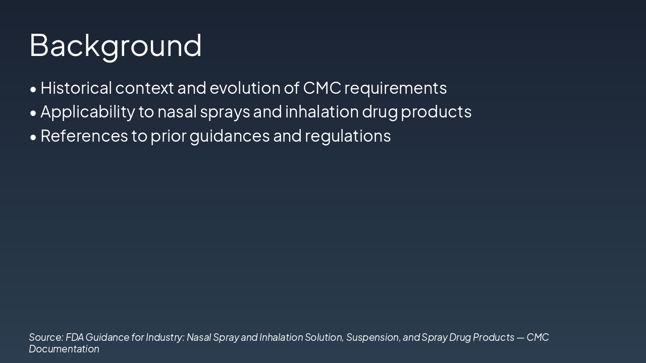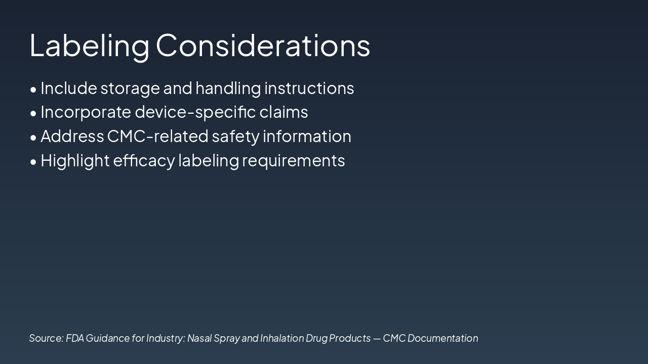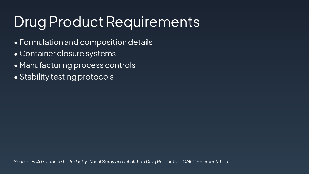 Source: FDA Guidance for Industry: Nasal Spray and Inhalation Solution, Suspension, and Spray Drug Products — CMC Documentation