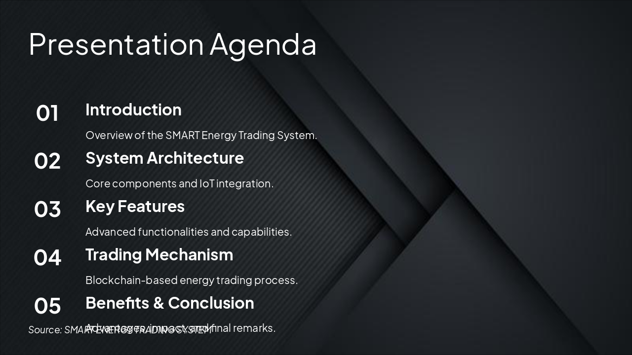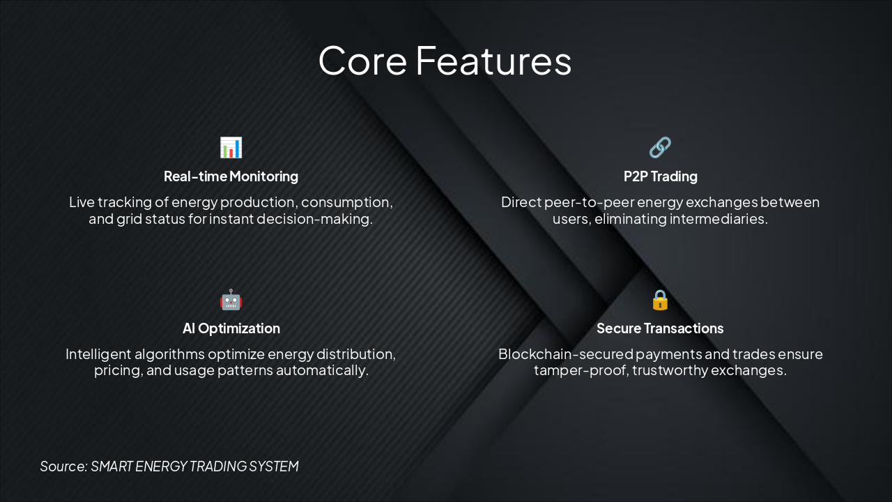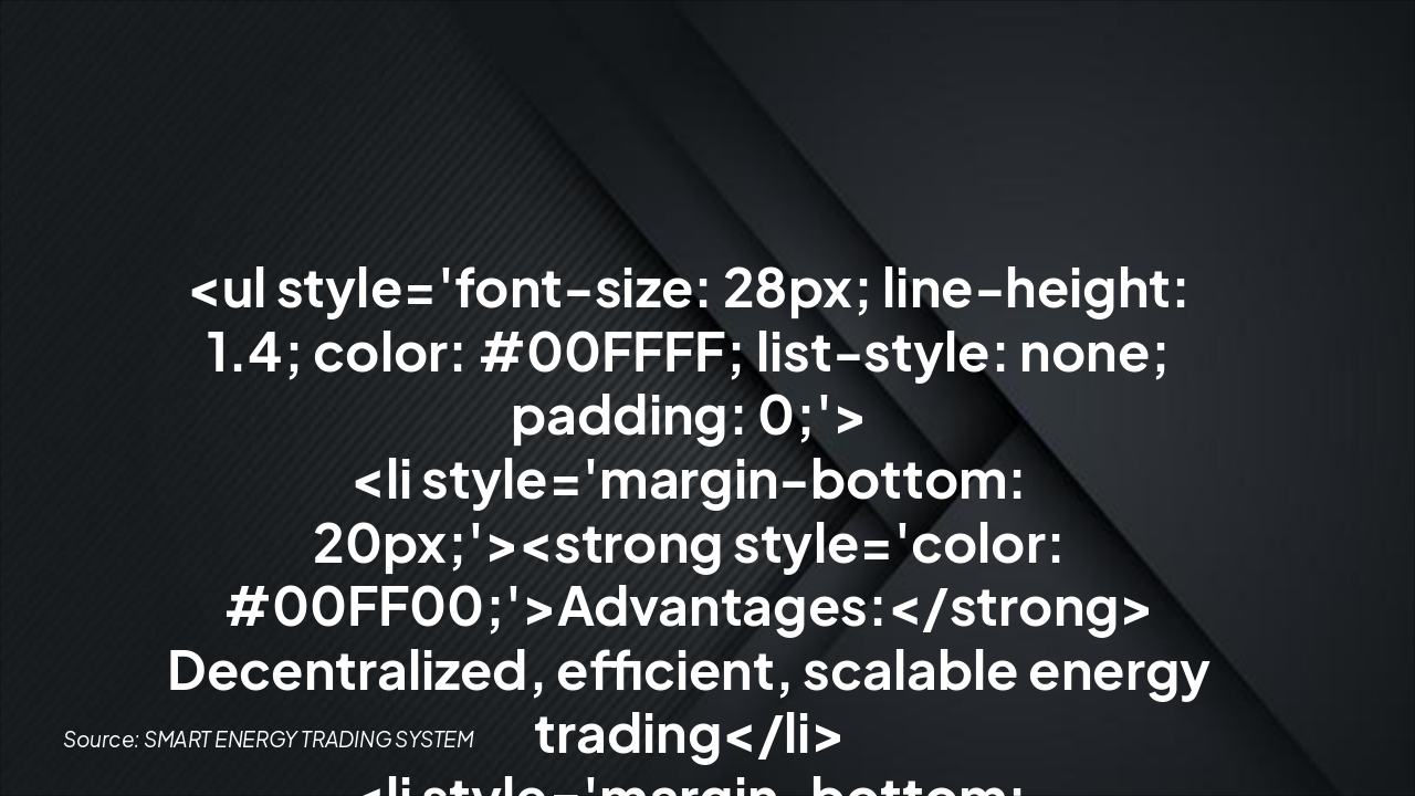 <ul style='font-size: 28px; line-height: 1.4; color: #00FFFF; list-style: none; padding: 0;'> <li style='margin-bottom: 20px;'><strong style='color: #00FF00;'>Advantages:</strong> Decentralized, efficient, scalable energy trading</li> <li style='margin-bottom: 20px;'><strong style='color: #00FF00;'>Next Steps:</strong> Pilot deployment, AI optimization, blockchain integration</li> <li style='margin-bottom: 20px; display: flex; align-items: center;'><span style='font-size: 40px; margin-right: 15px;'>⚡</span><strong style='color: #FF00FF;'>Call to Action:</strong> Join the smart energy revolution today – collaborate now!</li> <li style='margin-top: 40px; font-size: 24px; color: #00FFFF; text-align: center;'>Thank You!</li> <li style='font-size: 18px; color: #888; text-align: center;'>Questions? Let's discuss the future of energy.</li> </ul>