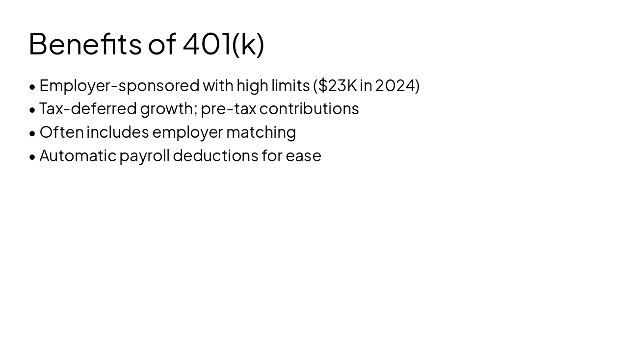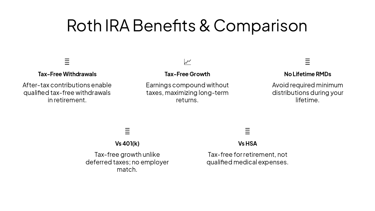 { "features": [ { "icon": "💸", "heading": "Tax-Free Withdrawals", "description": "After-tax contributions enable qualified tax-free withdrawals in retirement." }, { "icon": "📈", "heading": "Tax-Free Growth", "description": "Earnings compound without taxes, maximizing long-term returns." }, { "icon": "🚫", "heading": "No Lifetime RMDs", "description": "Avoid required minimum distributions during your lifetime." }, { "icon": "🏢", "heading": "Vs 401(k)", "description": "Tax-free growth unlike deferred taxes; no employer match." }, { "icon": "🏥", "heading": "Vs HSA", "description": "Tax-free for retirement, not qualified medical expenses." } ] }