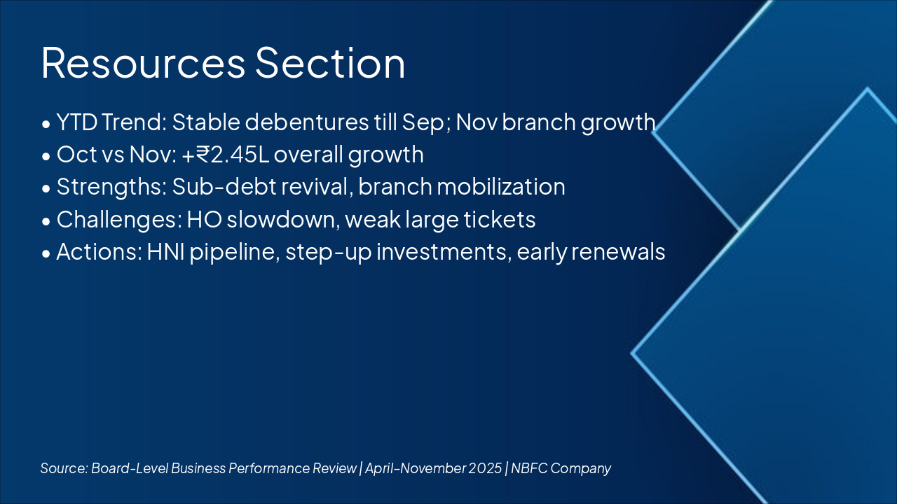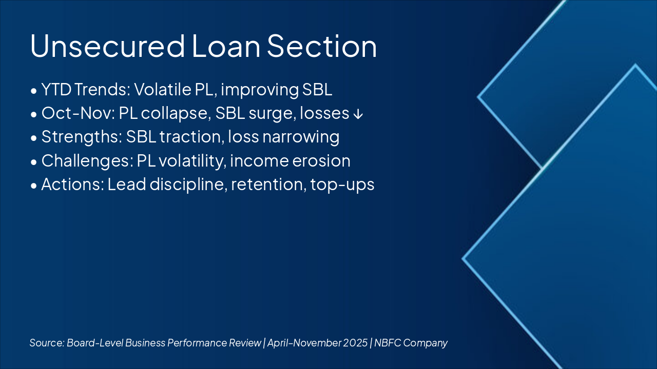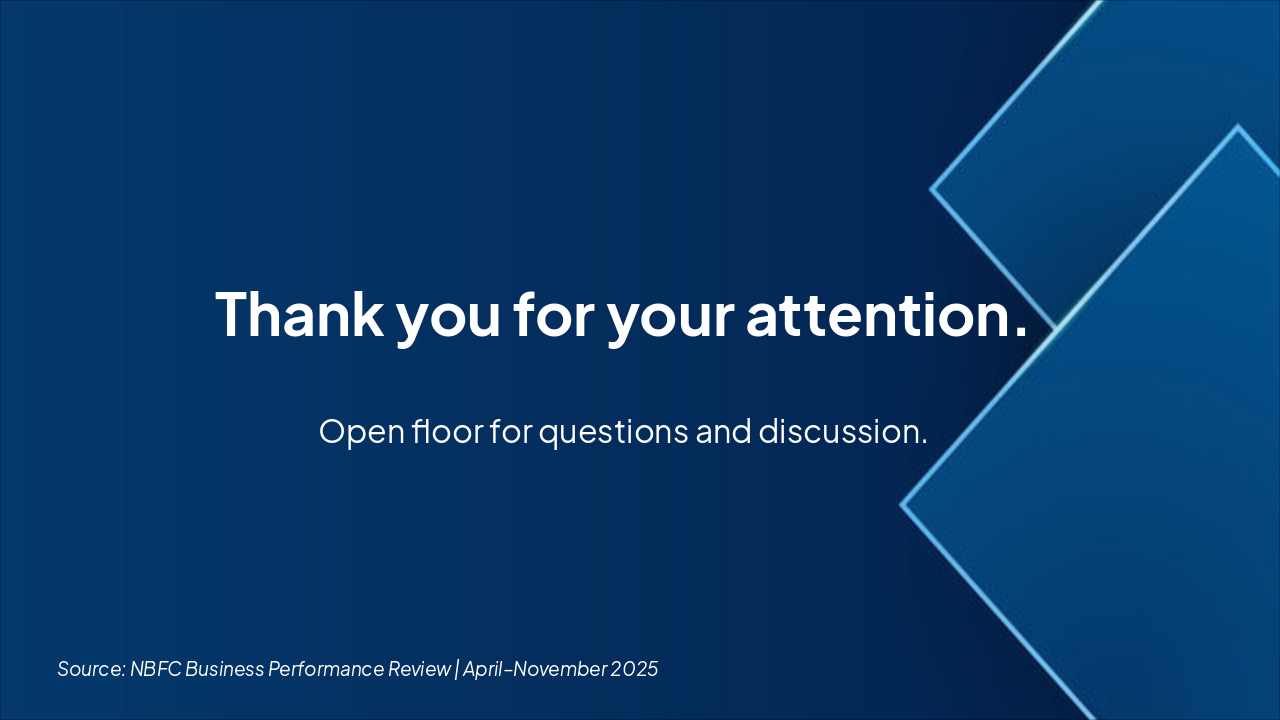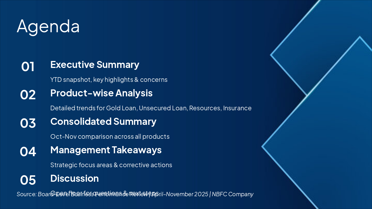 Source: Title: NBFC Business Performance Review (April–November 2025). Company name placeholder. Minimal NBFC/finance icon. Palette: Grey/Beige/Light Blue/White. Context: Board-Level Business Performance Review | April–November 2025 | NBFC Company