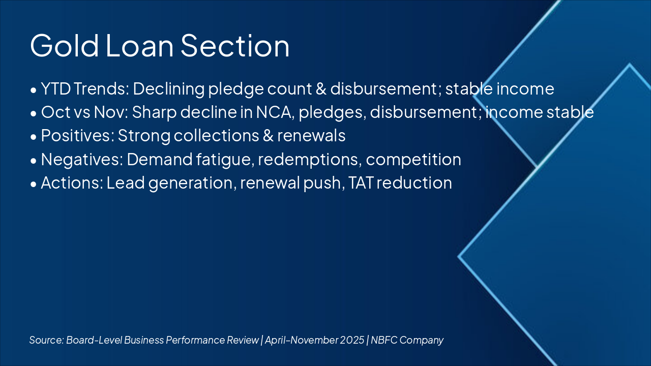 This is a cover slide titled "NBFC Business Performance Review (April–November 2025)". The subtitle specifies a board-level review of Gold Loan, Unsecured, Resources, and Insurance sectors.
