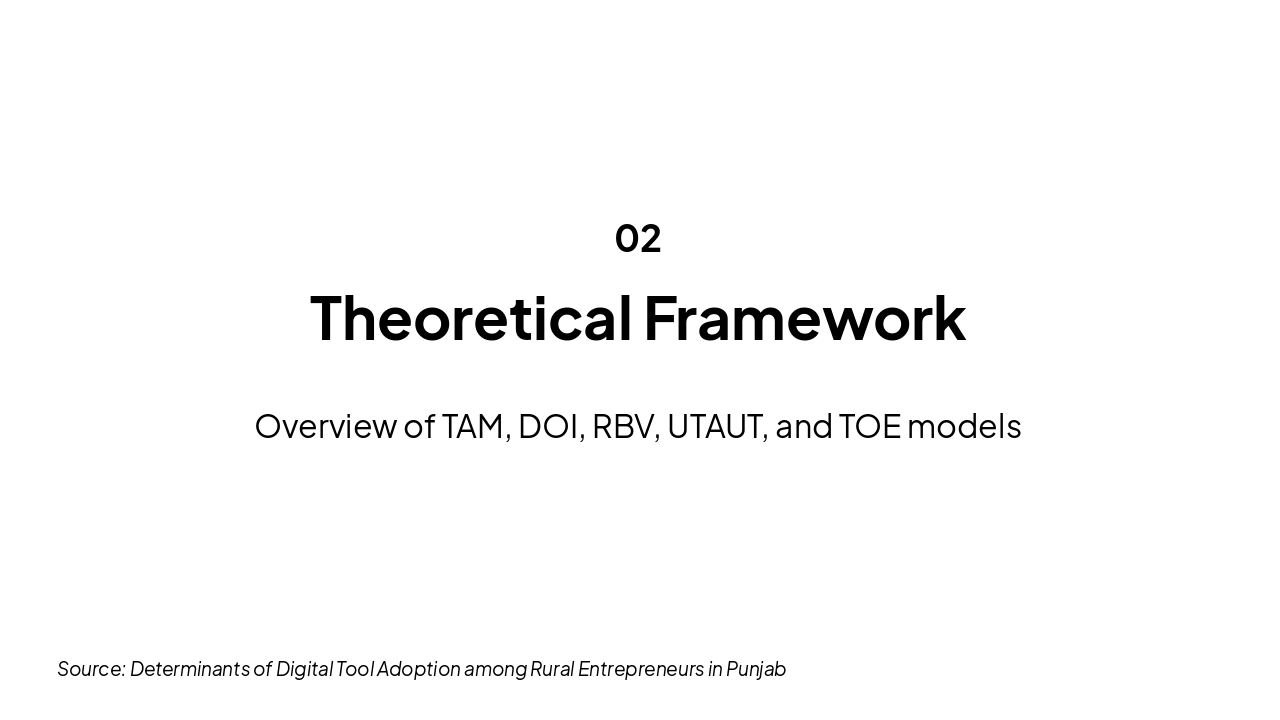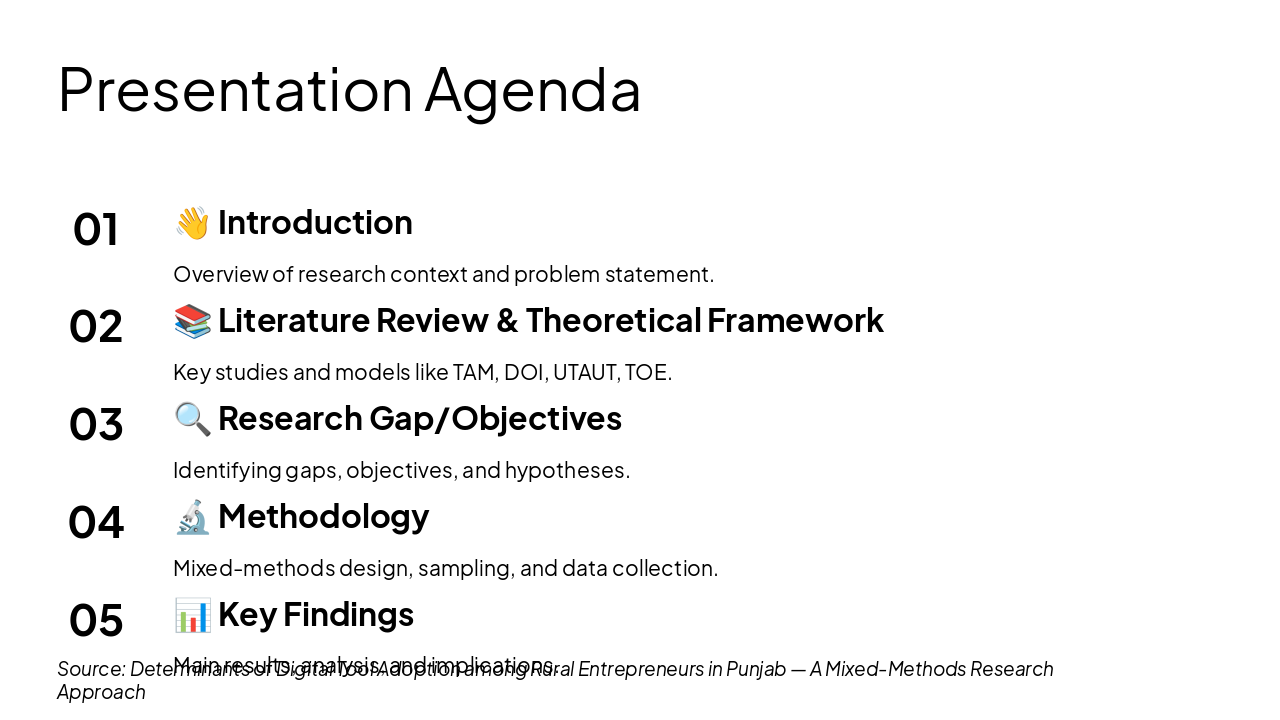 This agenda slide outlines the presentation structure, starting with an Introduction to the research context, followed by Literature Review & Theoretical Framework covering key models like TAM, DOI, UTAUT, and TOE. It then covers Research Gap/Objectives, Methodology with mixed-methods design, and Key Findings with main results and implications.