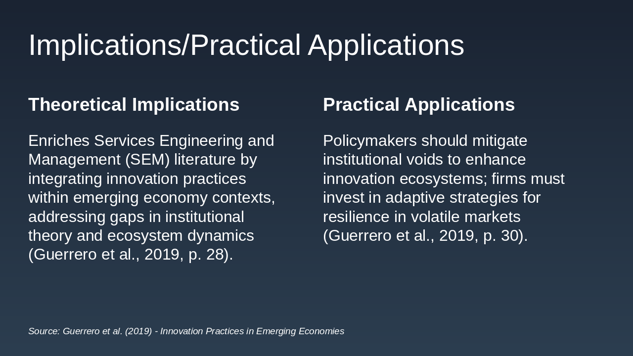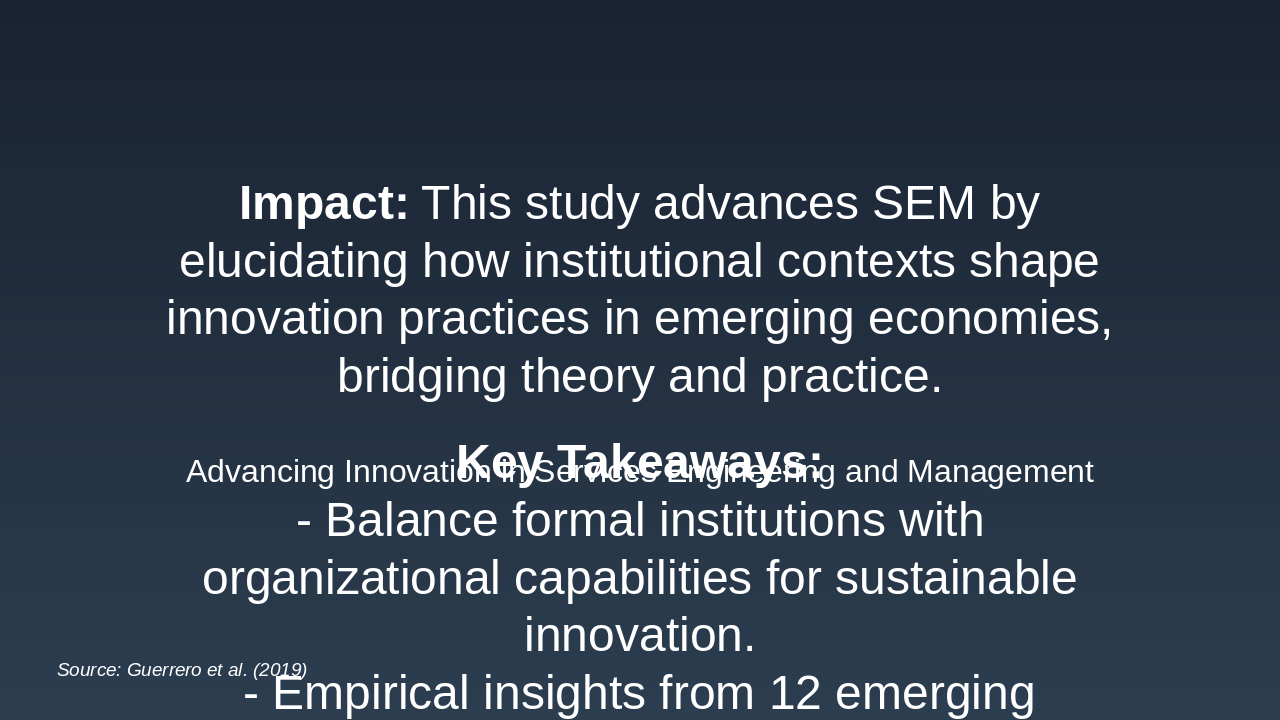 The slide summarizes the study's impact by advancing Services Engineering and Management (SEM) through insights into how institutional contexts influence innovation in emerging economies, bridging theory and practice with a nuanced framework for policy and management. Key takeaways emphasize balancing formal institutions and organizational capabilities for sustainable innovation, drawing from empirical data across 12 economies, with a closing call to apply these frameworks in real-world SEM projects under the motto "Innovate globally, balance locally."