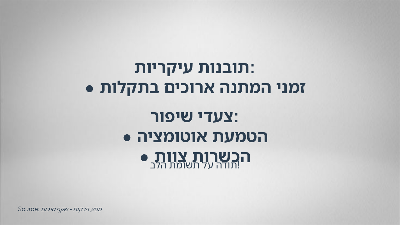 השקופית מסכמת תובנות עיקריות: זמני המתנה ארוכים בתקלות. צעדי שיפור מוצעים: הטמעת אוטומציה והכשרות צוות, עם תודה על תשומת הלב.