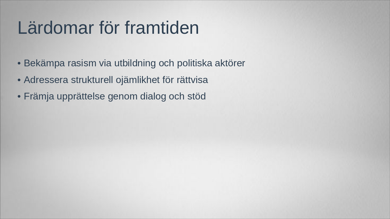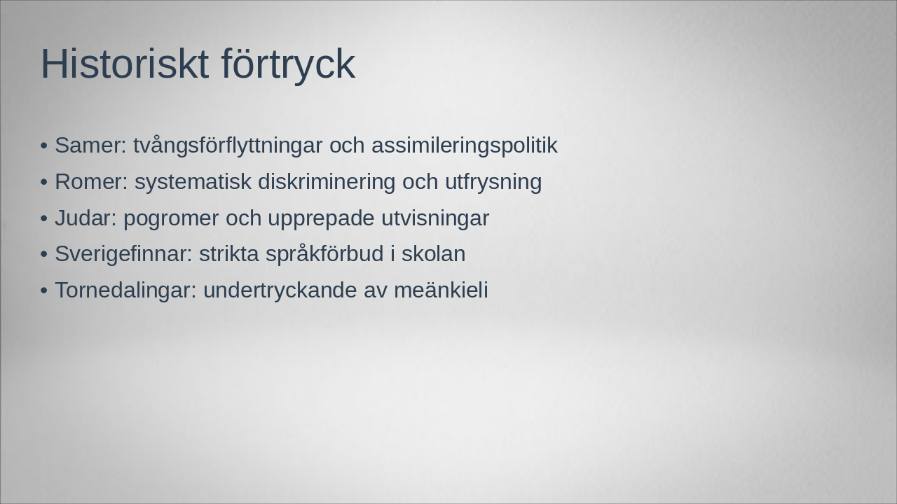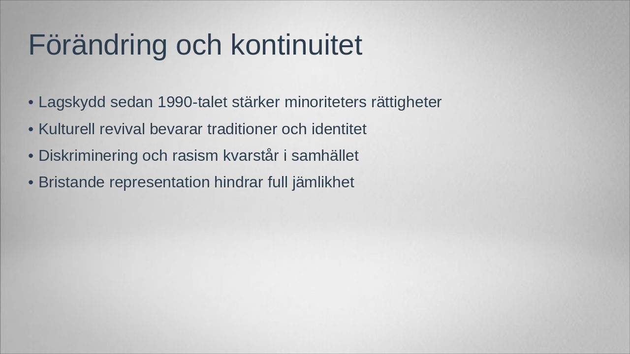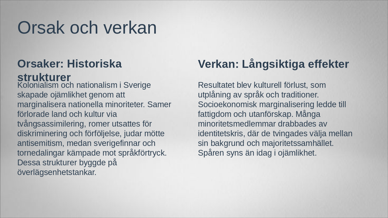 | Kolonialism och nationalism i Sverige skapade ojämlikhet genom att marginalisera nationella minoriteter. Samer förlorade land och kultur via tvångsassimilering, romer utsattes för diskriminering och förföljelse, judar mötte antisemitism, medan sverigefinnar och tornedalingar kämpade mot språkförtryck. Dessa strukturer byggde på överlägsenhetstankar. | Resultatet blev kulturell förlust, som utplåning av språk och traditioner. Socioekonomisk marginalisering ledde till fattigdom och utanförskap. Många minoritetsmedlemmar drabbades av identitetskris, där de tvingades välja mellan sin bakgrund och majoritetssamhället. Spåren syns än idag i ojämlikhet. |