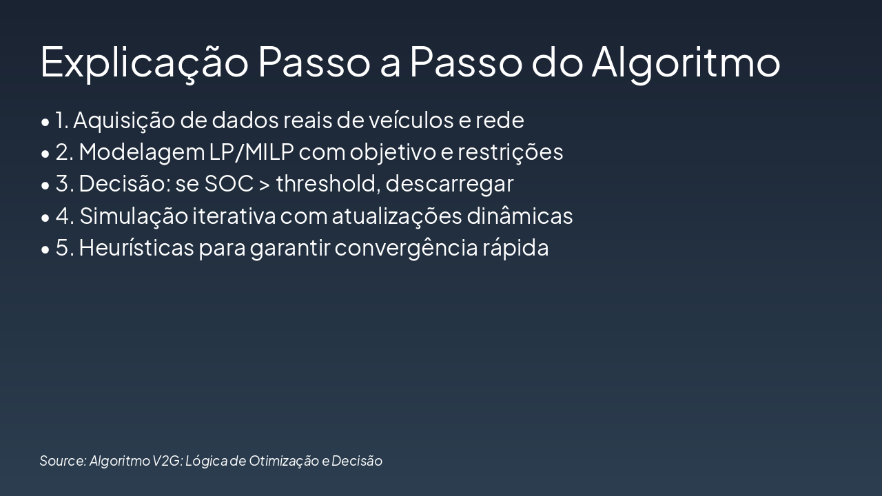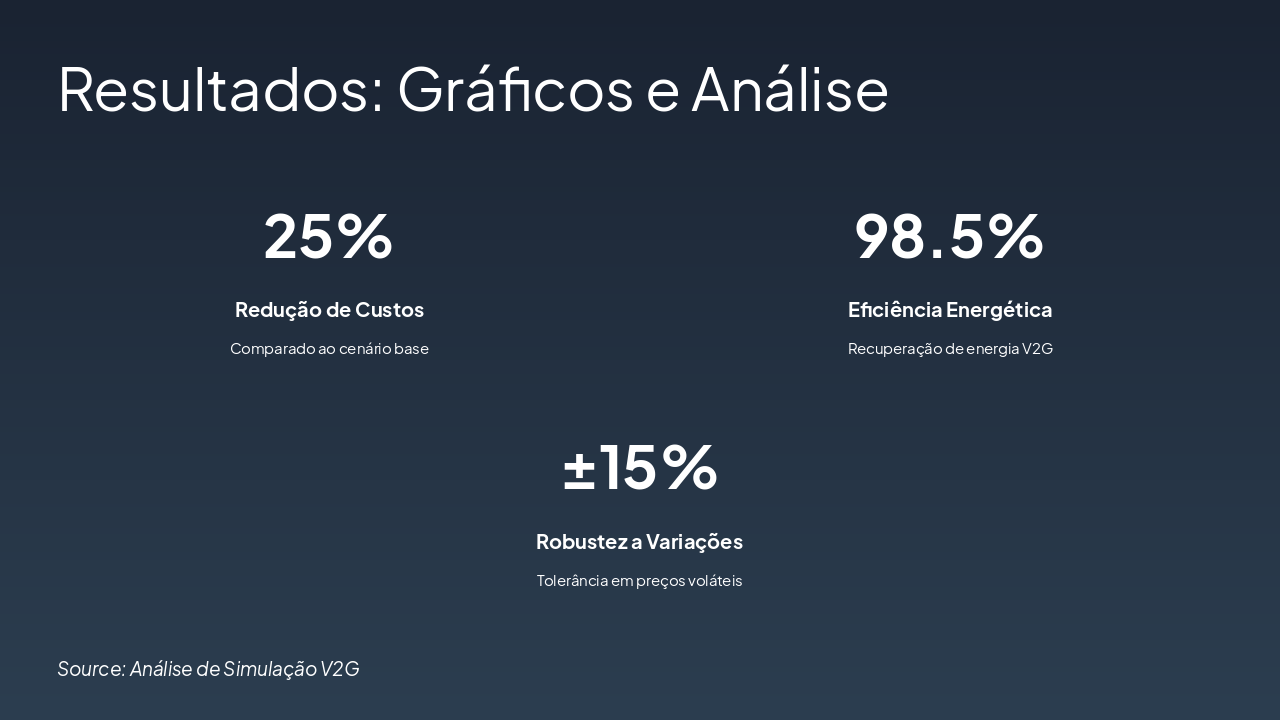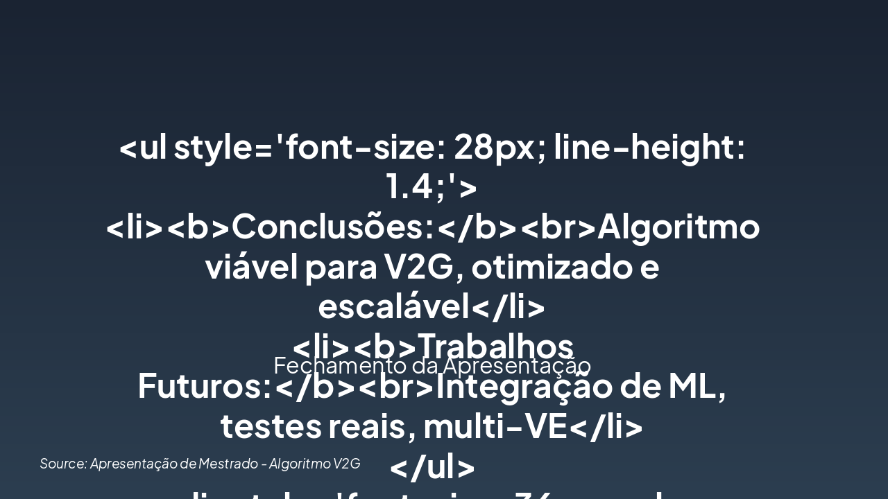 <ul style='font-size: 28px; line-height: 1.4;'> <li><b>Conclusões:</b><br>Algoritmo viável para V2G, otimizado e escalável</li> <li><b>Trabalhos Futuros:</b><br>Integração de ML, testes reais, multi-VE</li> </ul> <div style='font-size: 36px; color: #2E86C1; margin-top: 40px; font-weight: bold;'>Obrigado!<br>Perguntas?</div>