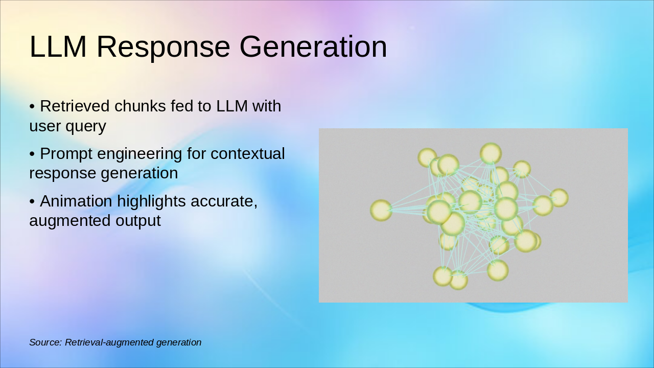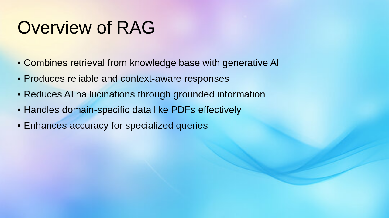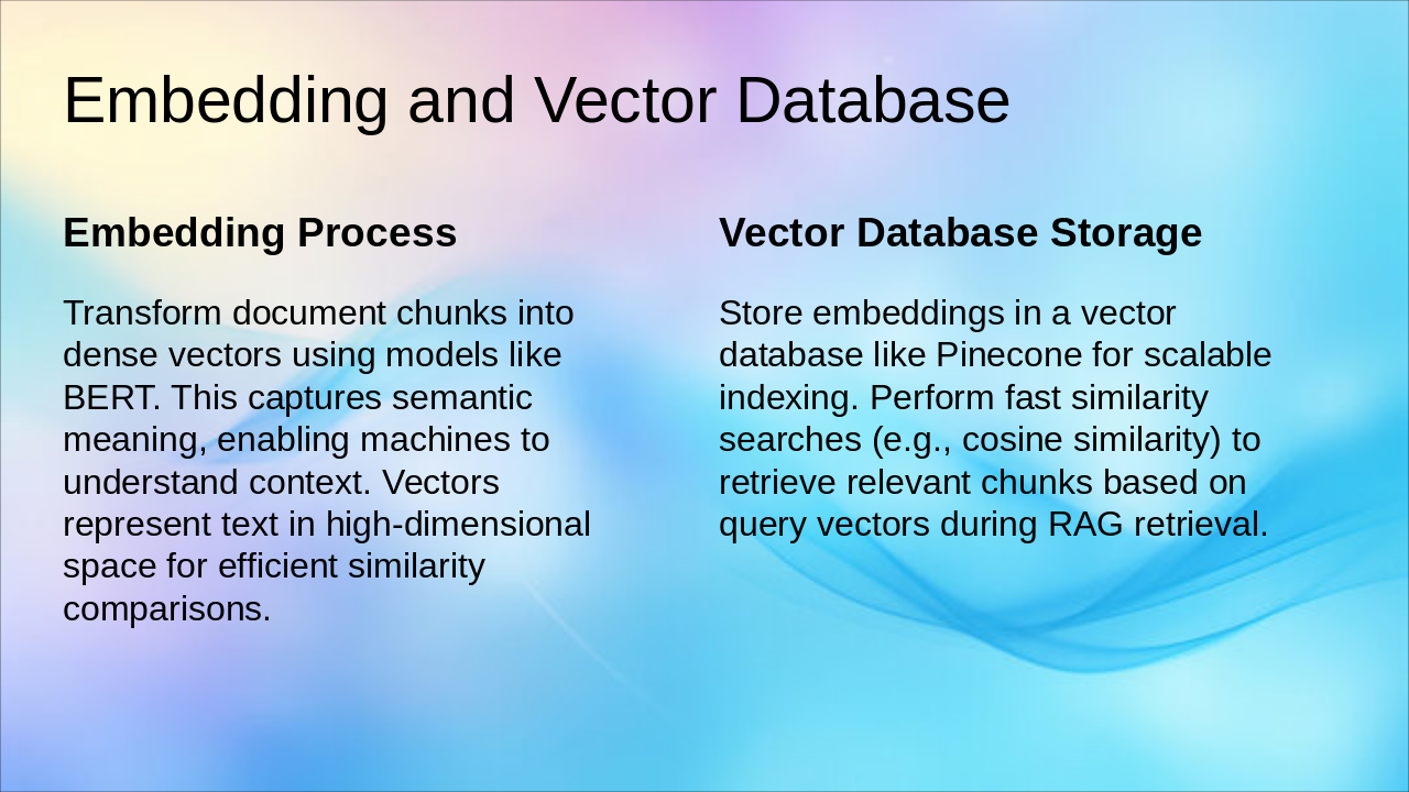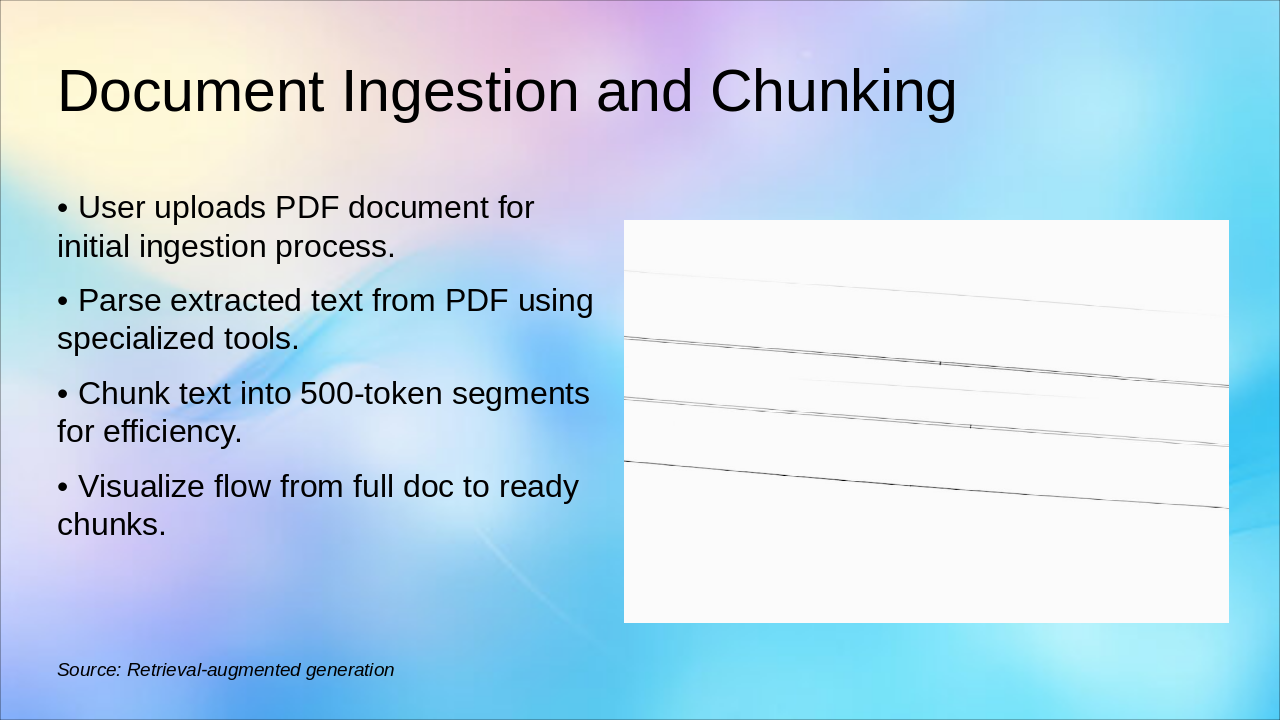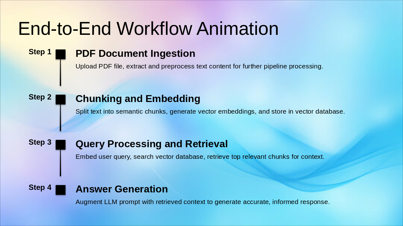 Step 1: PDF Document Ingestion Upload PDF file, extract and preprocess text content for further pipeline processing. Step 2: Chunking and Embedding Split text into semantic chunks, generate vector embeddings, and store in vector database. Step 3: Query Processing and Retrieval Embed user query, search vector database, retrieve top relevant chunks for context. Step 4: Answer Generation Augment LLM prompt with retrieved context to generate accurate, informed response.
