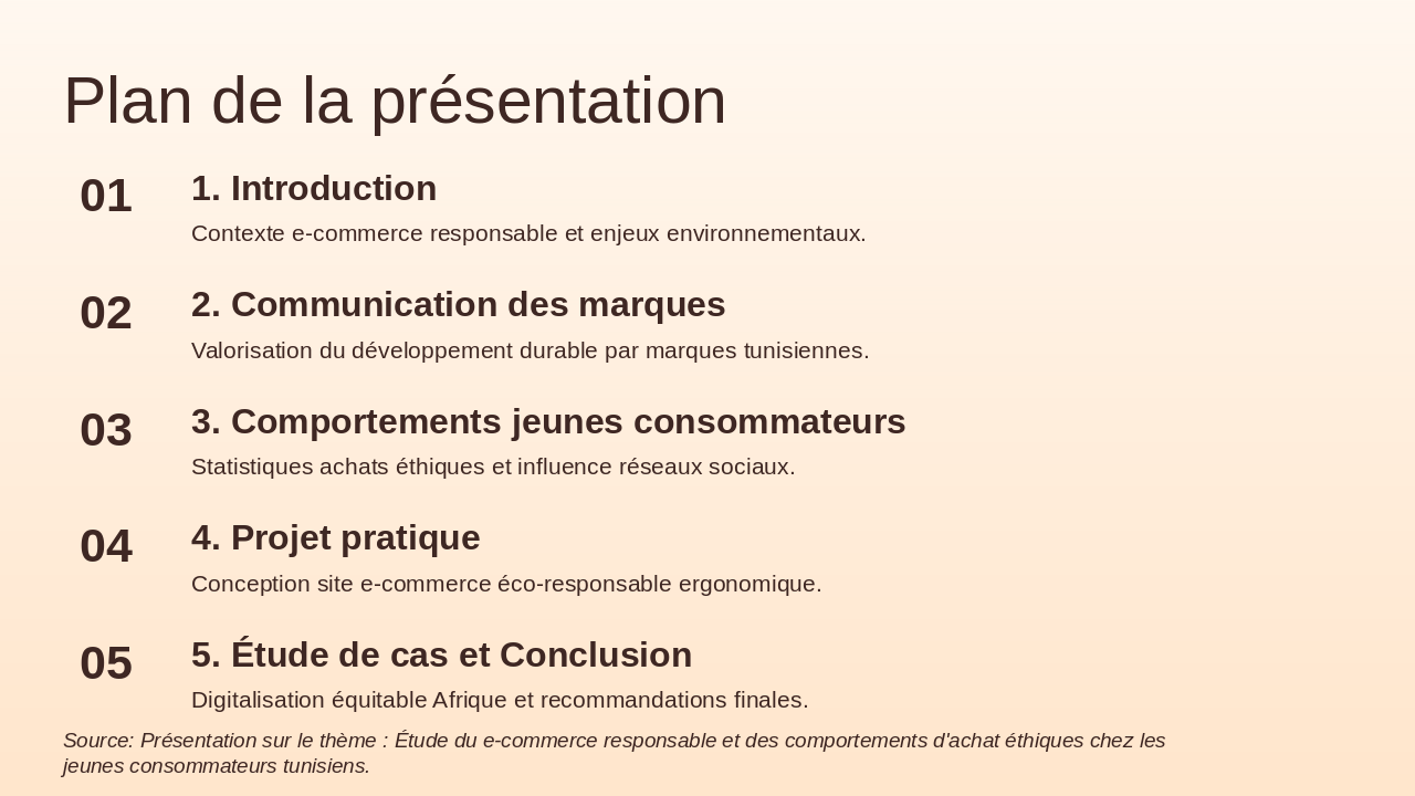 This agenda slide outlines the presentation plan in five sections: an introduction to responsible e-commerce and environmental challenges, brand communication on sustainability by Tunisian brands, and young consumers' ethical buying behaviors influenced by social media. It continues with a practical project designing an ergonomic eco-responsible e-commerce site, followed by a case study on equitable digitalization in Africa and final recommendations.