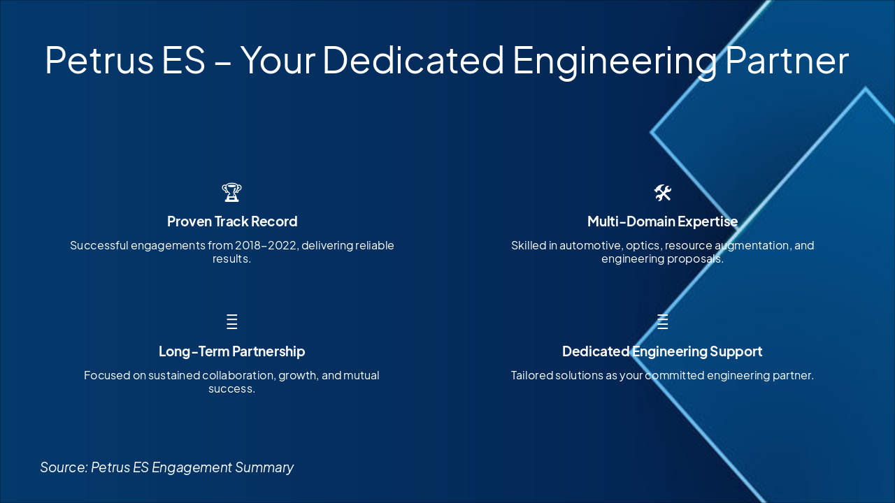 2018–2019: Resource Augmentation Supplied expert engineers to augment Pricol's development teams. 2021: Fresnel Lens Proposal Delivered innovative proposal for advanced Fresnel lens technology. 2022: ODC Proposal Proposed dedicated Offshore Development Center for sustained partnership.