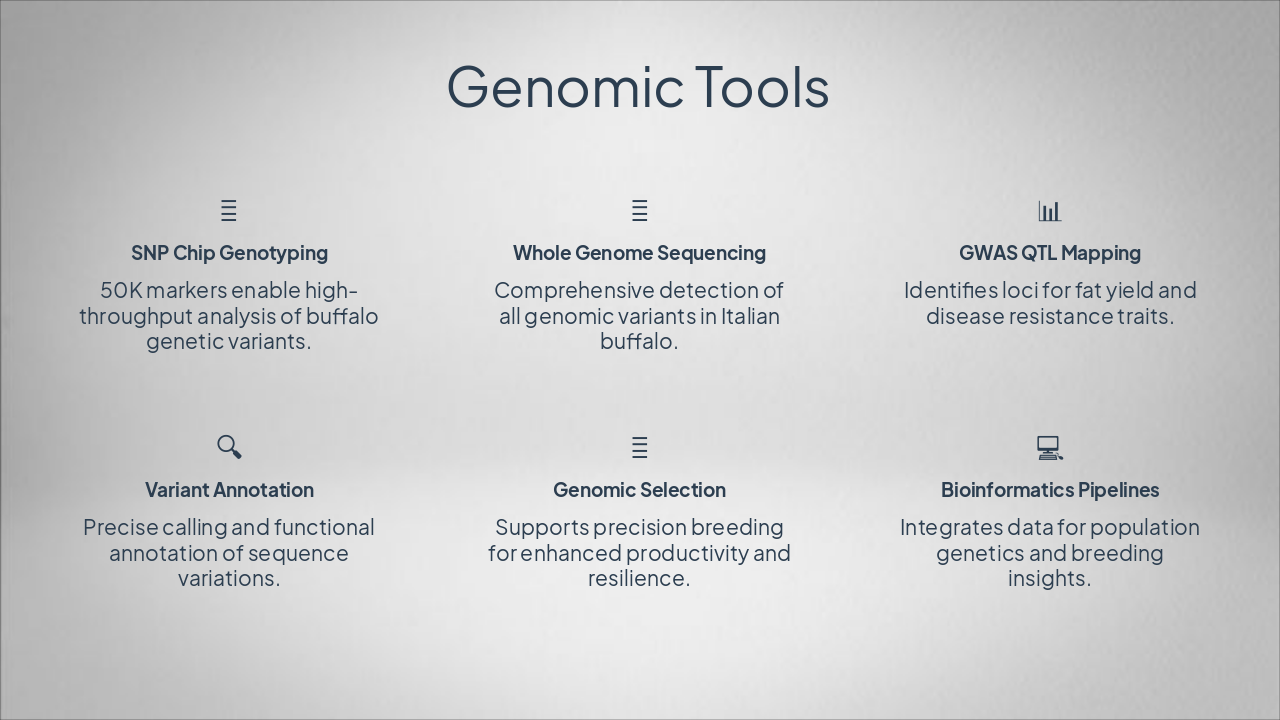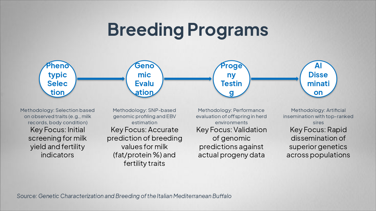 The breeding workflow for Italian Mediterranean Buffalo integrates phenotypic selection with genomic tools, emphasizing EBV for milk production (yield, fat, protein) and fertility traits (calving interval, conception rate). This multi-stage process ensures genetic progress while validating selections through progeny testing before dissemination via AI.