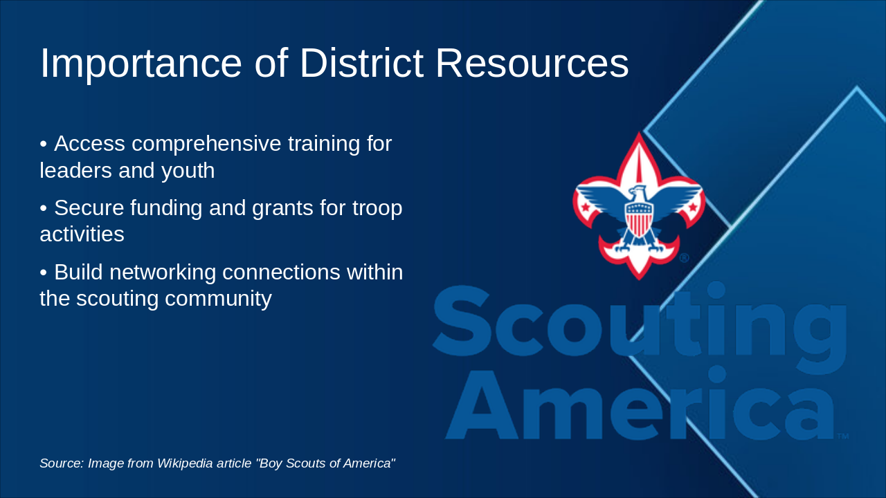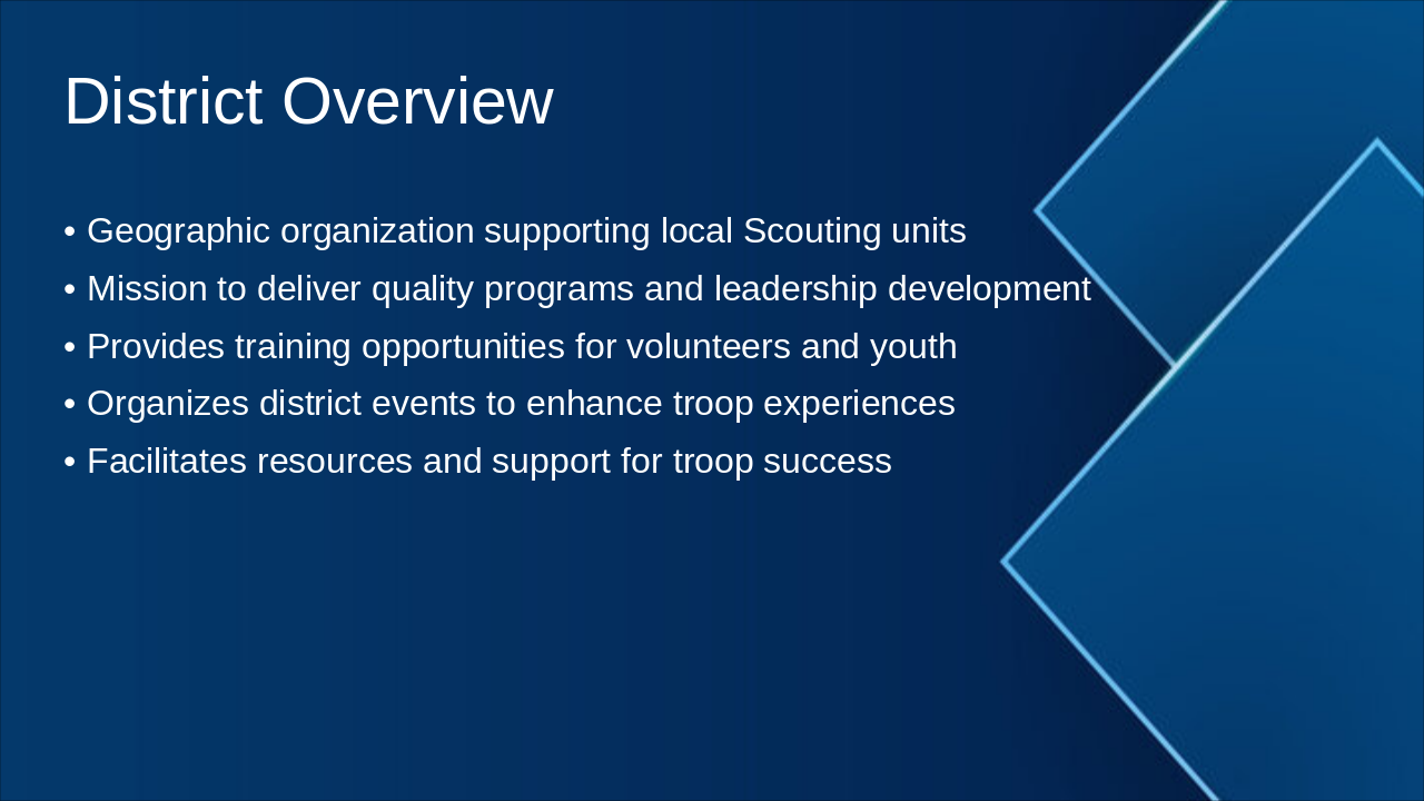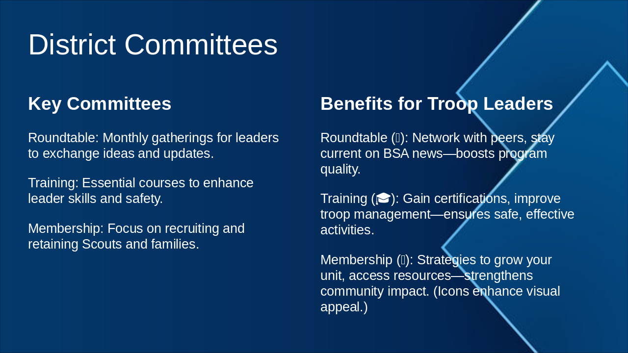 The slide outlines key district committees—Roundtable for monthly leader idea exchanges, Training for skill-building courses, and Membership for recruiting and retaining Scouts and families. It highlights benefits for troop leaders, including networking and updates from Roundtable, certifications and management improvements from Training, and growth strategies from Membership, with icons for visual enhancement.