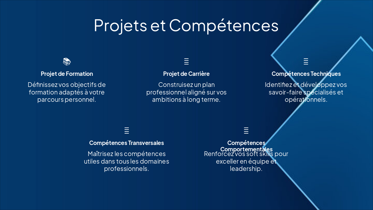 { "headers": [ "Étape", "Responsable", "Durée" ], "rows": [ [ "Découvrez votre potentiel", "Stagiaire", "1 semaine" ], [ "Parcours personnalisé avec conseiller", "Conseiller", "2 semaines" ], [ "Projet professionnel", "Stagiaire & Conseiller", "1 mois" ], [ "Pacte d’engagement", "Stagiaire", "Immédiat" ], [ "Objectifs personnels", "Stagiaire", "Continu" ] ] }