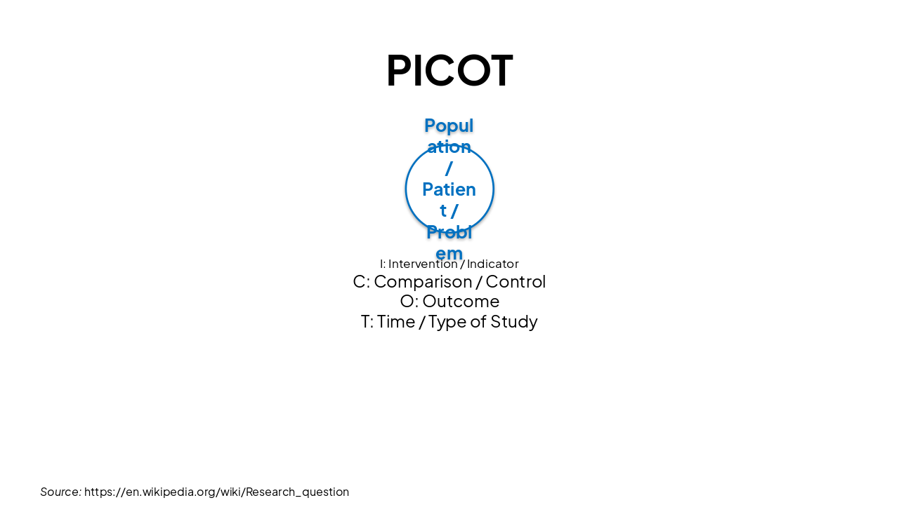 | Population / Patient / Problem | Intervention / Indicator | Comparison / Control | Outcome | Time / Type of Study |