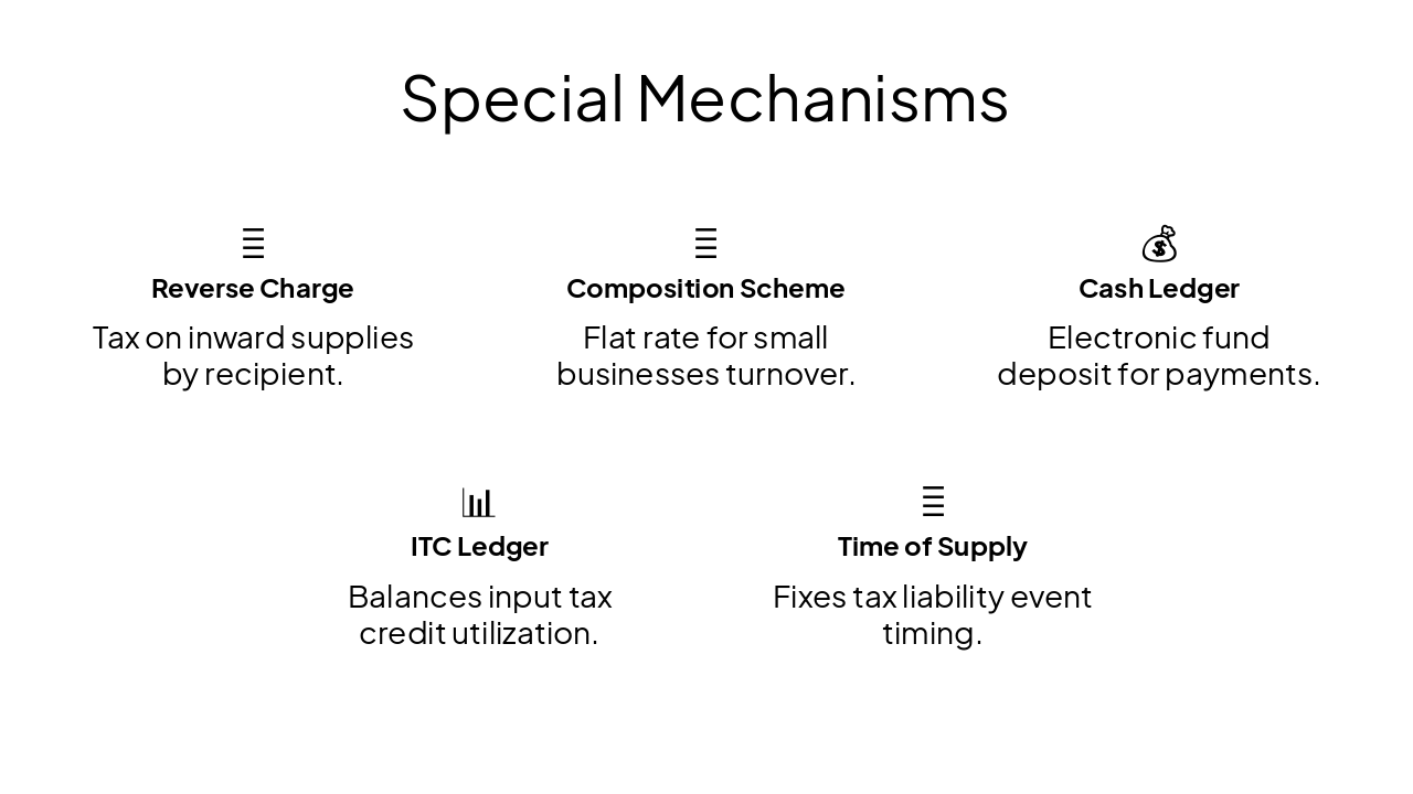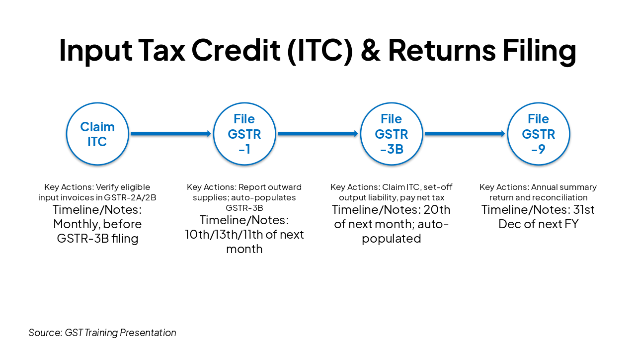 ITC flow: Claim on inputs > set-off output liability. Returns: GSTR-1 (outward), GSTR-3B (summary), GSTR-9 (annual). Filing deadlines & auto-population.