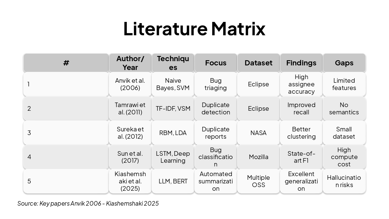 Create a 15–18 slide presentation for the DRC research proposal titled 'Intelligent Bug Triage using Machine Learning for Agile Teams'. Use the exact content from the provided document (MS Research Synopsis). Include these sections: 1. Title Slide – Project title, student name (Muhammad Zohaib Anwar), supervisor (Dr. Mustafa Hameed), department, university. 2. Contents Slide – Overview of presentation sections. 3. Introduction (1) – Agile issue tracking and bug triage background. 4. Introduction (2) – Importance of automation in bug triage. 5. Problem Statement – Manual triage challenges: time, inconsistency, scalability, knowledge gaps. 6. Research Questions – RQ1 (Accuracy), RQ2 (Feature Importance), RQ3 (Explainability). 7. Research Objectives – Goals: model development, explainability, integration. 8. Research Significance – Academic and industrial impact. 9. Literature Review (1) – Evolution from classical ML to transformers. 10. Literature Review (2) – Table/summary of key works and research gaps. 11. Identified Research Gaps – Data size, explainability, integration issues. 12. Proposed Methodology Framework (1) – Dataset collection and preprocessing. 13. Proposed Methodology Framework (2) – Model development (TF-IDF, XGBoost, DistilBERT). 14. Proposed Methodology Framework (3) – Evaluation metrics and explainability (SHAP). 15. Expected Results – Accuracy comparison and practical outcomes. 16. Research Timeline – 6-month plan (collection, training, evaluation, deployment). 17. References – Full reference list (APA 6 format). 18. Acknowledgement Slide – Thank you/QA. Design requirements: - Unique and modern AI/ML-inspired design - Futuristic gradient background (blue/purple/cyan) - Use neural network and data visualization motifs - Clean, professional typography with icons and diagrams - Slide layout diversity (mix of charts, text blocks, visuals) - Minimal clutter, consistent theme