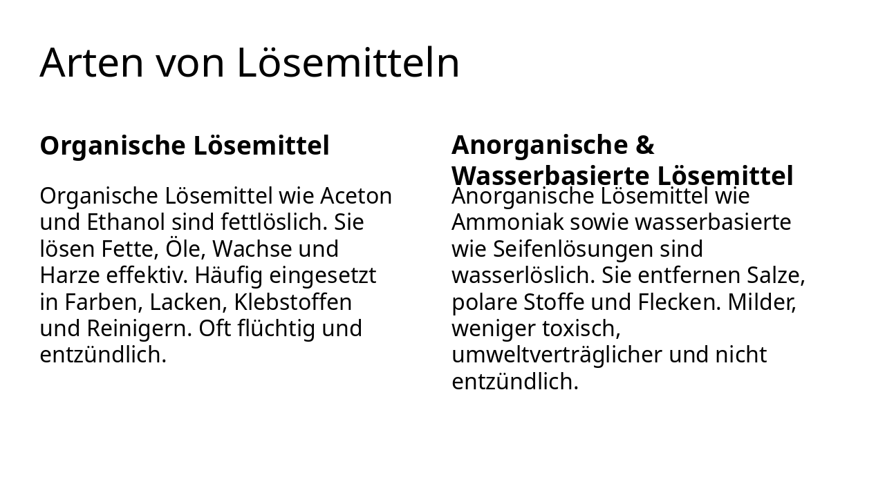 | Organische Lösemittel wie Aceton und Ethanol sind fettlöslich. Sie lösen Fette, Öle, Wachse und Harze effektiv. Häufig eingesetzt in Farben, Lacken, Klebstoffen und Reinigern. Oft flüchtig und entzündlich. | Anorganische Lösemittel wie Ammoniak sowie wasserbasierte wie Seifenlösungen sind wasserlöslich. Sie entfernen Salze, polare Stoffe und Flecken. Milder, weniger toxisch, umweltverträglicher und nicht entzündlich. |
