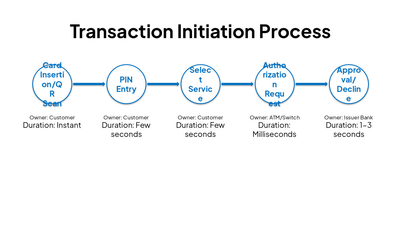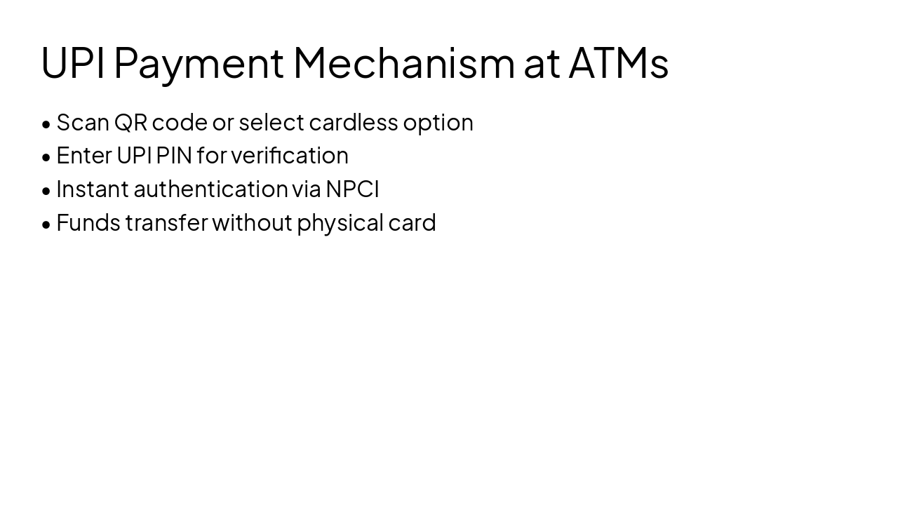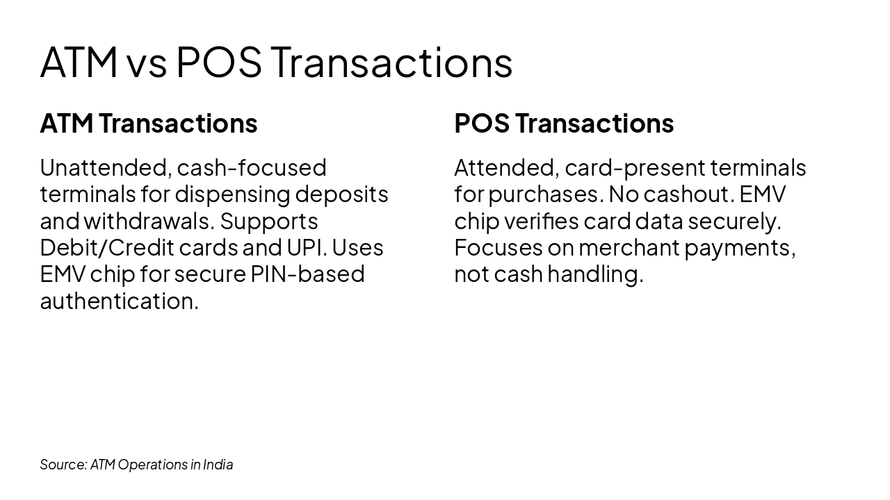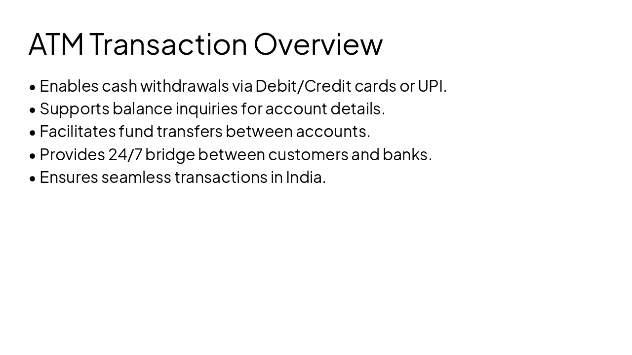 The "Transaction Types" slide is a table listing five ATM transactions—Cash Withdrawal, Balance Enquiry, Funds Transfer, Mini Statement, and PIN Change—along with their functions and supported methods. All support Debit/Credit cards, with UPI available for all except Funds Transfer and PIN Change (Debit only).