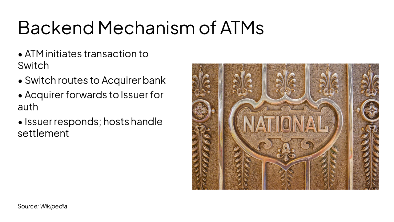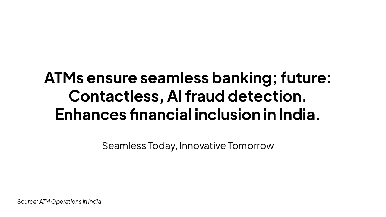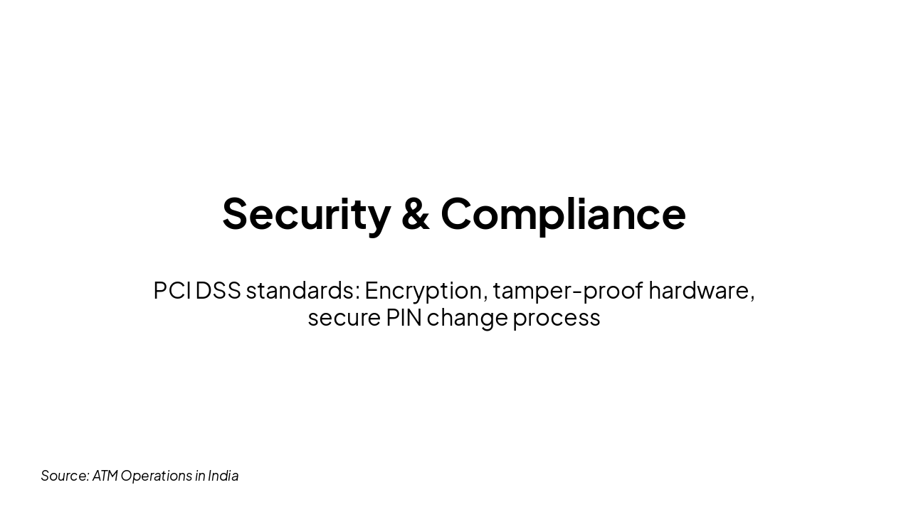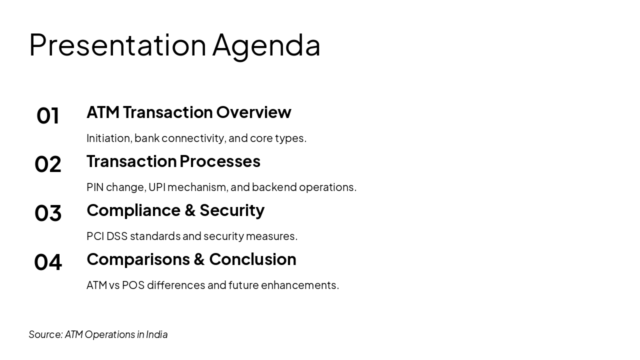 The "Transaction Types" slide is a table listing five ATM transactions—Cash Withdrawal, Balance Enquiry, Funds Transfer, Mini Statement, and PIN Change—along with their functions and supported methods. All support Debit/Credit cards, with UPI available for all except Funds Transfer and PIN Change (Debit only).