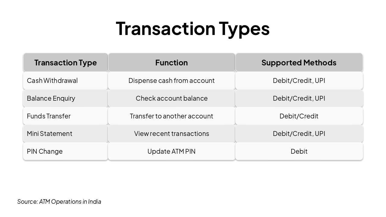{ "headers": [ "Transaction Type", "Function", "Supported Methods" ], "rows": [ [ "Cash Withdrawal", "Dispense cash from account", "Debit/Credit, UPI" ], [ "Balance Enquiry", "Check account balance", "Debit/Credit, UPI" ], [ "Funds Transfer", "Transfer to another account", "Debit/Credit" ], [ "Mini Statement", "View recent transactions", "Debit/Credit, UPI" ], [ "PIN Change", "Update ATM PIN", "Debit" ] ] }