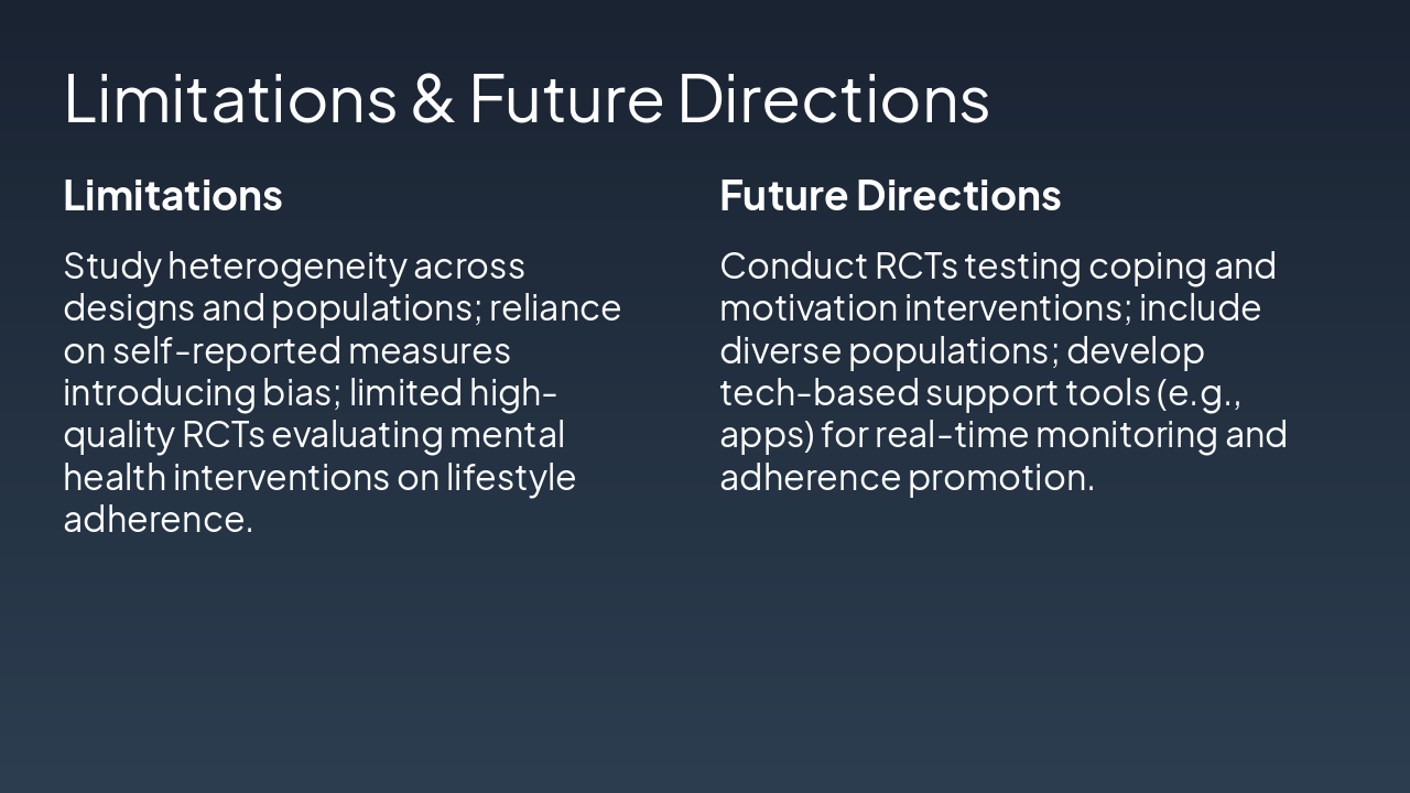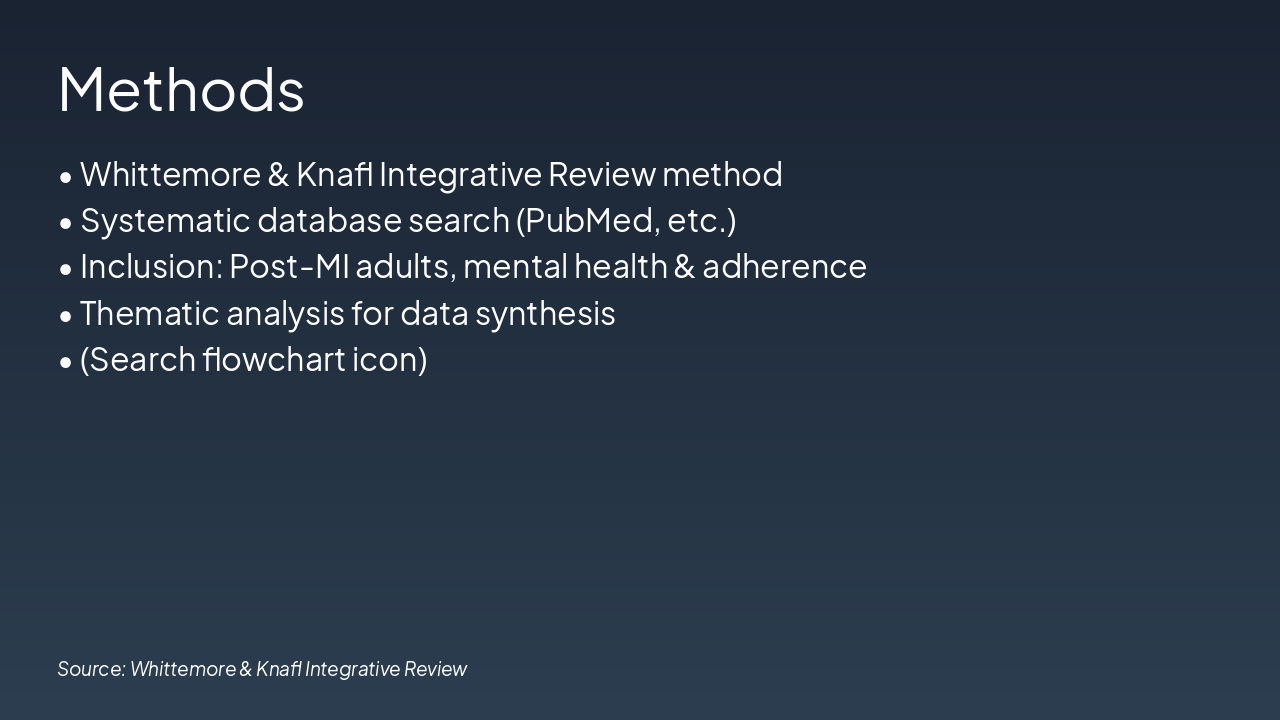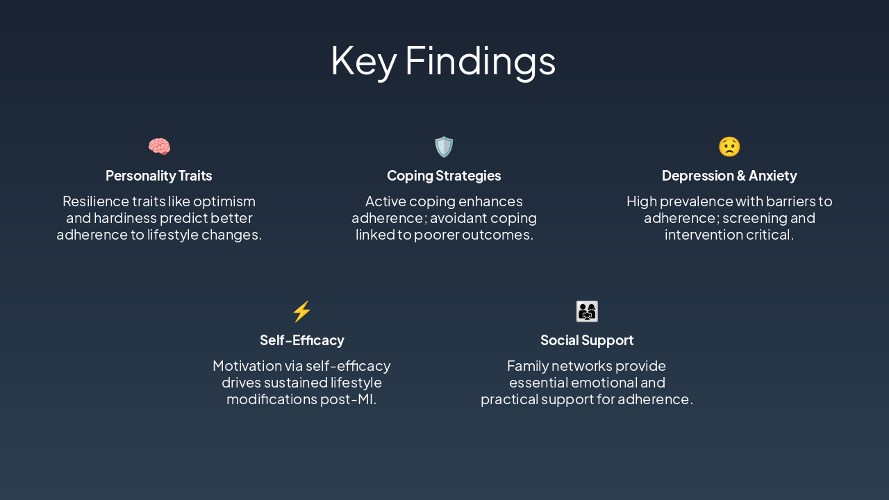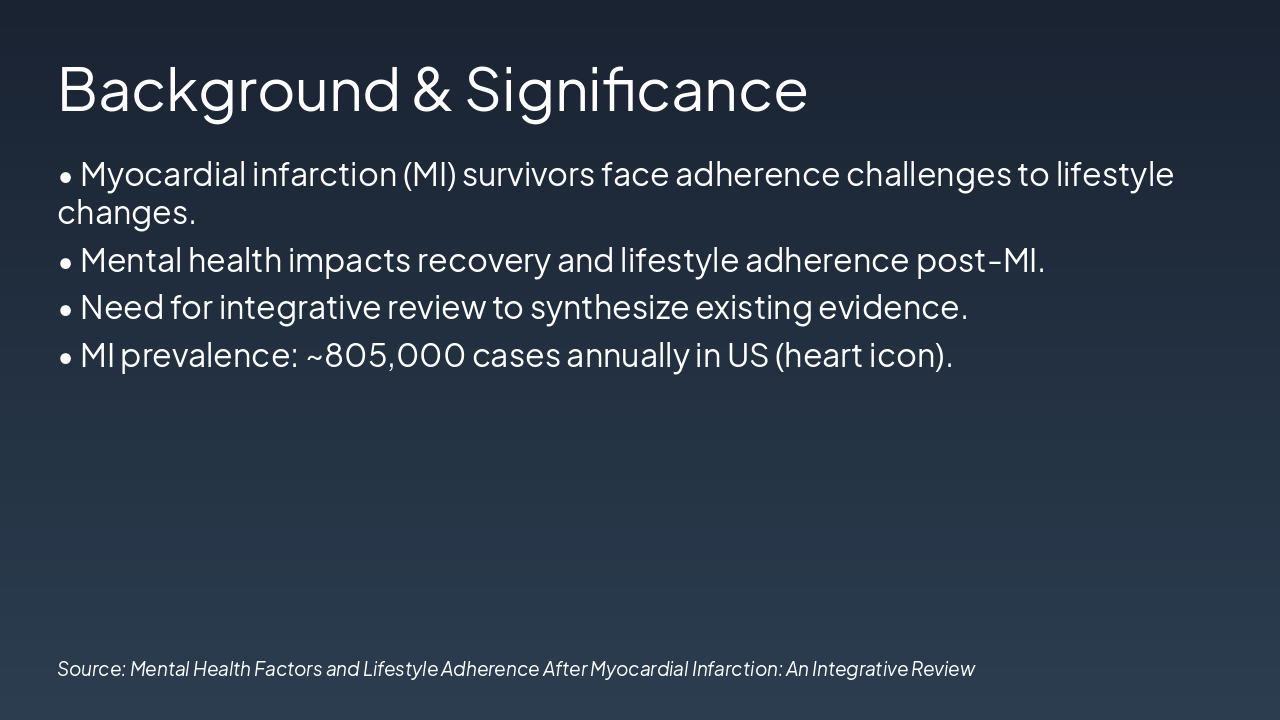 <h2>Key Takeaway</h2><p>Mental health is crucial for post-MI adherence; apply frameworks for better outcomes.</p><h2>Selected References (APA Style)</h2><ul><li>Author, A. A. (Year). Title of article. <i>Journal Name</i>, volume(issue), pages.</li><li>Author, B. B., & Author, C. C. (Year). Title of book. Publisher.</li></ul><h2>Thank you!</h2><p>Questions?</p><p><strong>Contact:</strong> your.email@university.edu | @yourhandle</p>