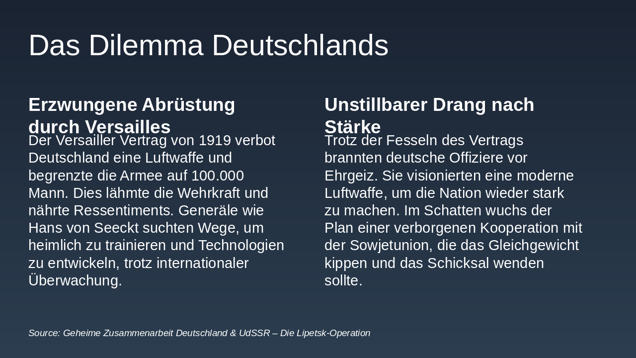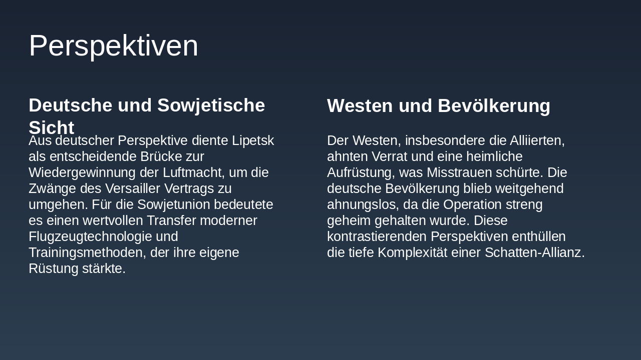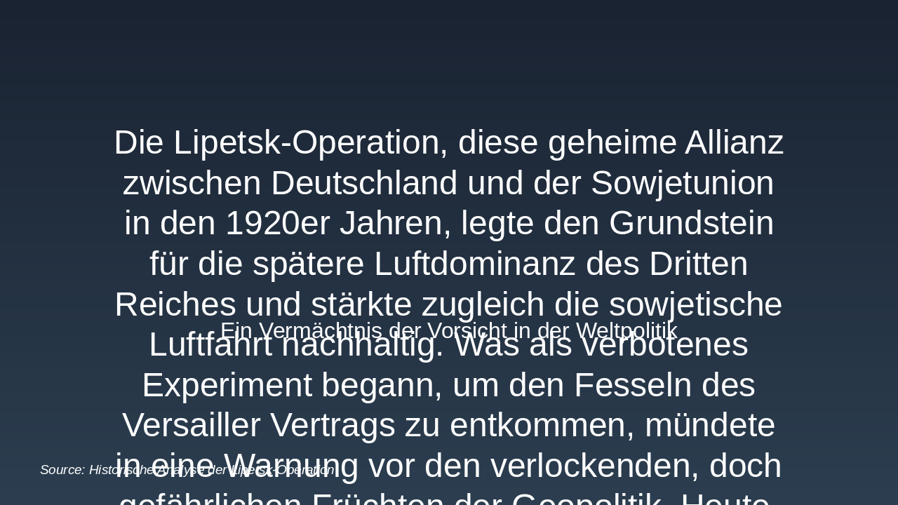 Die Lipetsk-Operation, diese geheime Allianz zwischen Deutschland und der Sowjetunion in den 1920er Jahren, legte den Grundstein für die spätere Luftdominanz des Dritten Reiches und stärkte zugleich die sowjetische Luftfahrt nachhaltig. Was als verbotenes Experiment begann, um den Fesseln des Versailler Vertrags zu entkommen, mündete in eine Warnung vor den verlockenden, doch gefährlichen Früchten der Geopolitik. Heute, im Rückblick auf die zerbrechlichen Grenzen des Friedens, erinnert uns Lipetsk daran, wie scheinbar unschuldige Kooperationen zu unvorhergesehenen Konsequenzen führen können – ein Vermächtnis, das uns mahnt, die Schatten der Geschichte nicht zu vergessen.