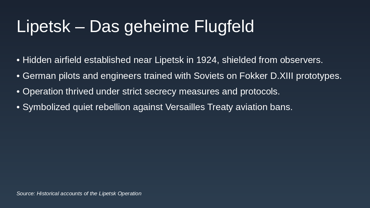 The Lipetsk Operation, a secret 1920s alliance between Germany and the Soviet Union, laid the foundation for Nazi Germany's later air dominance while bolstering Soviet aviation, serving as a cautionary tale of evading the Treaty of Versailles through forbidden cooperation. In retrospect, it warns of how seemingly innocent geopolitical partnerships can lead to unforeseen consequences, urging us to remember history's shadows amid fragile peace.