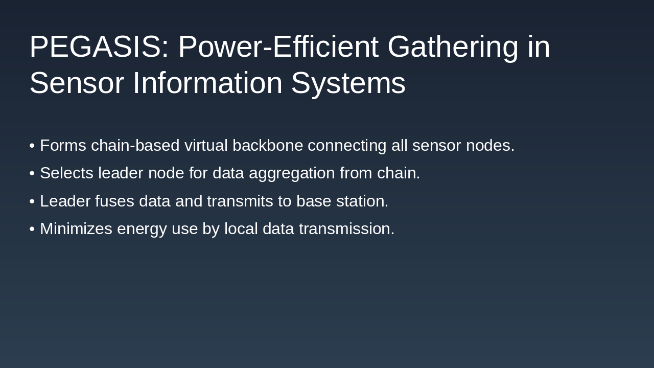 PEGASIS enhances WSN efficiency via chain-based gathering.