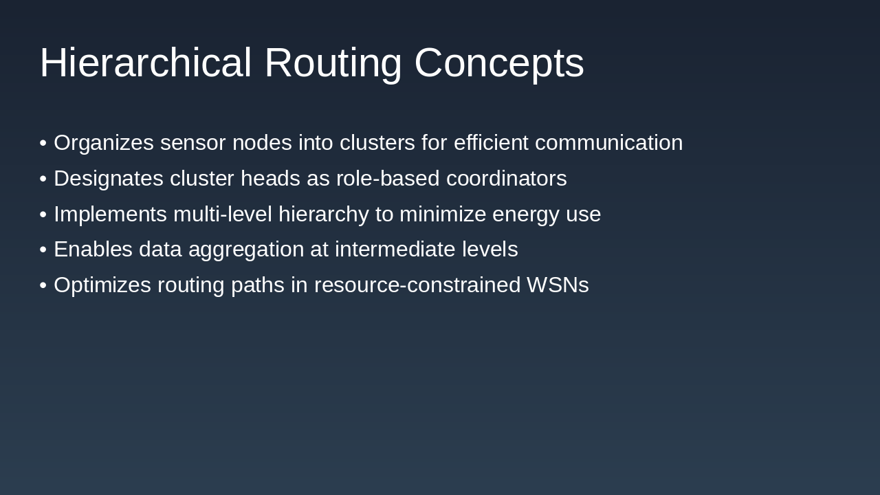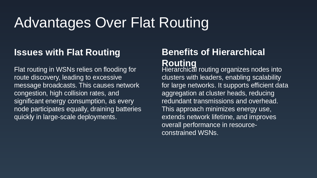 - Hierarchical routing reduces energy consumption.