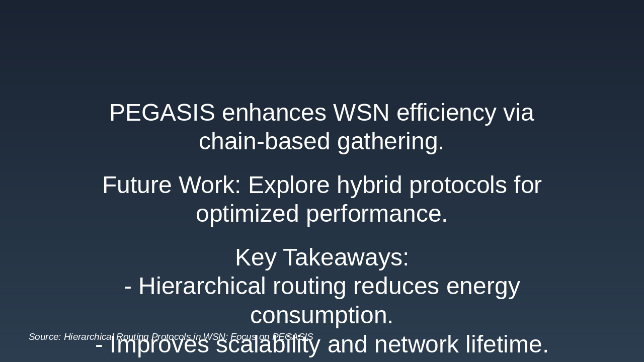 PEGASIS improves wireless sensor network efficiency through chain-based data gathering, with future work focusing on hybrid protocols for better performance. Key takeaways highlight how hierarchical routing cuts energy use, boosts scalability, and extends network lifetime, followed by an invitation for questions on WSN routing advancements.