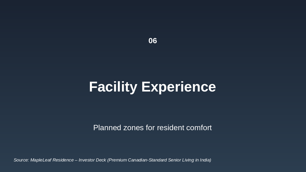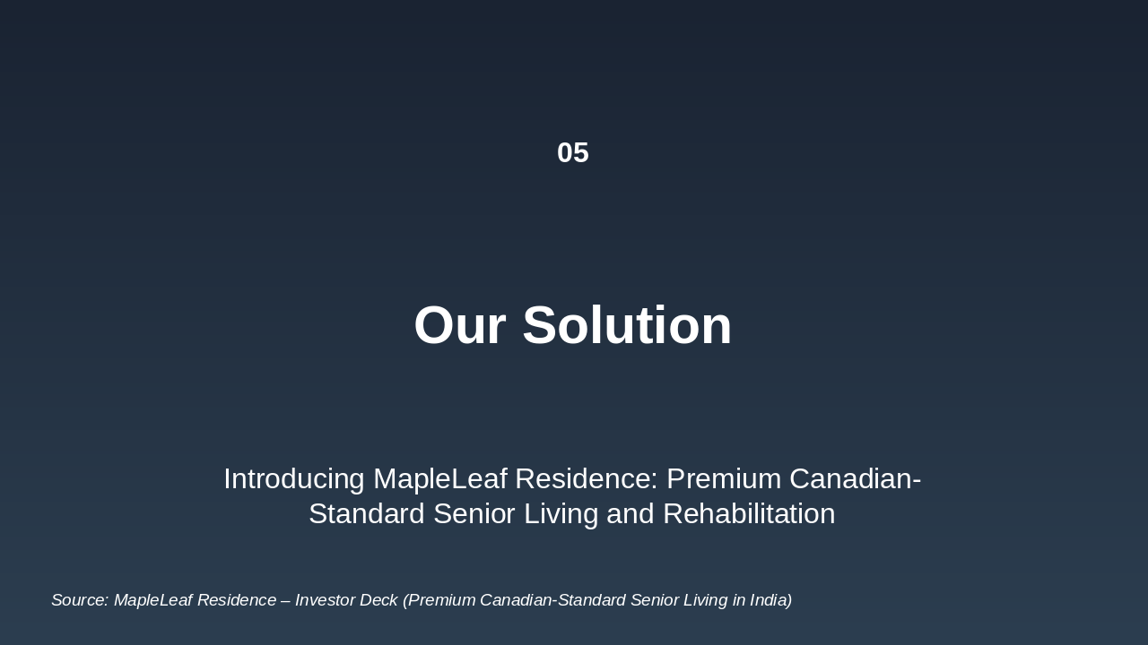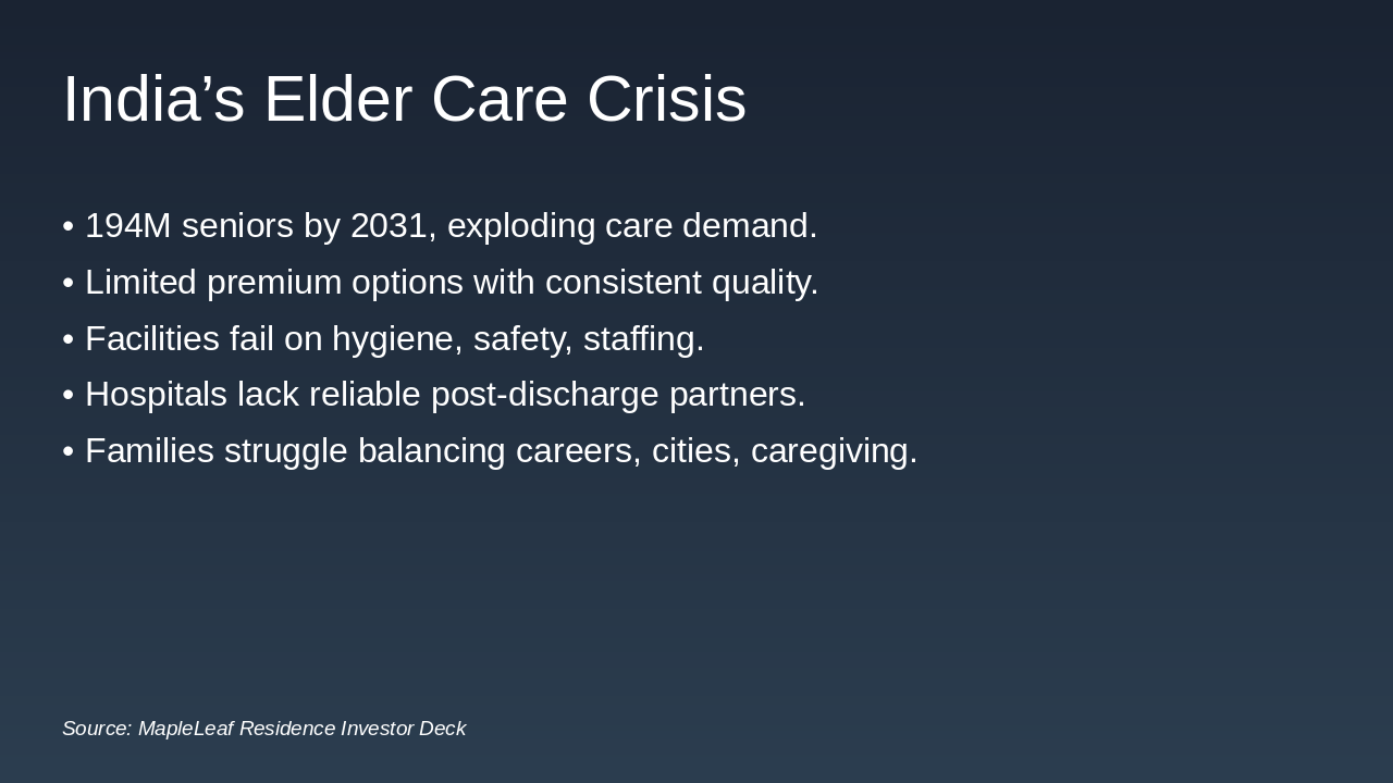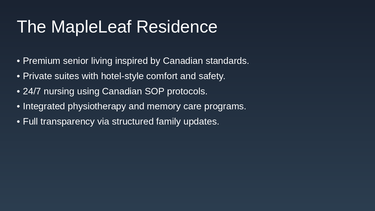 Generate a full investor presentation titled 'MapleLeaf Residence – Investor Deck (Premium Canadian-Standard Senior Living in India)' using the detailed slide content below, extracted from the Python-pptx script.