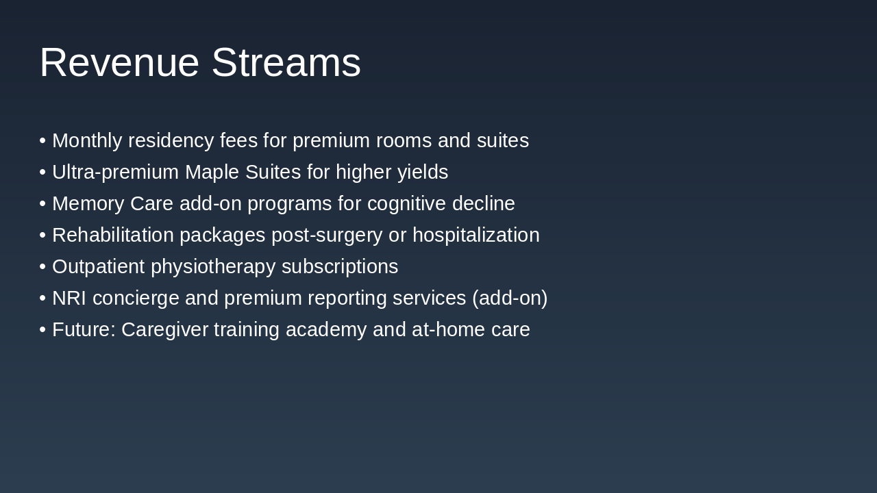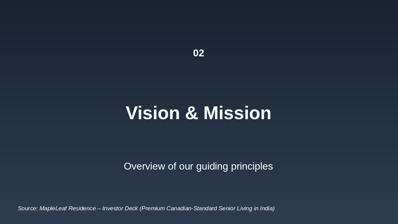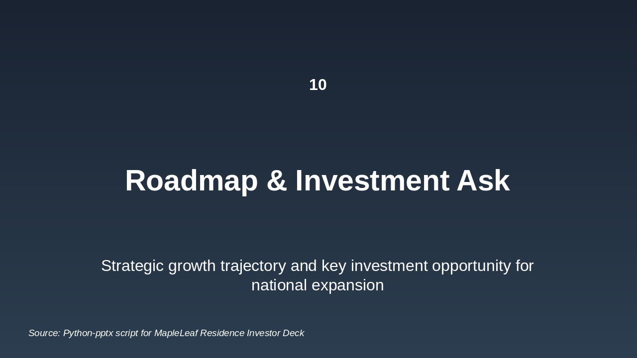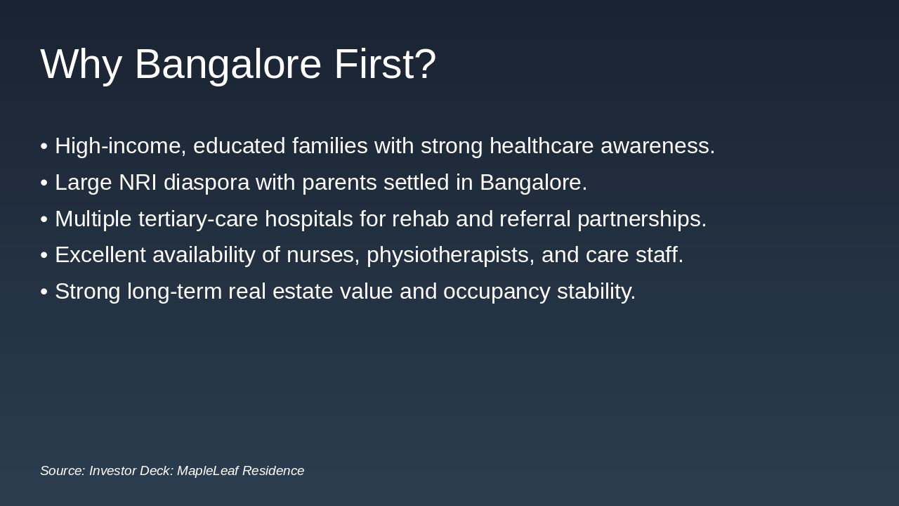 Generate a full investor presentation titled 'MapleLeaf Residence – Investor Deck (Premium Canadian-Standard Senior Living in India)' using the detailed slide content below, extracted from the Python-pptx script.