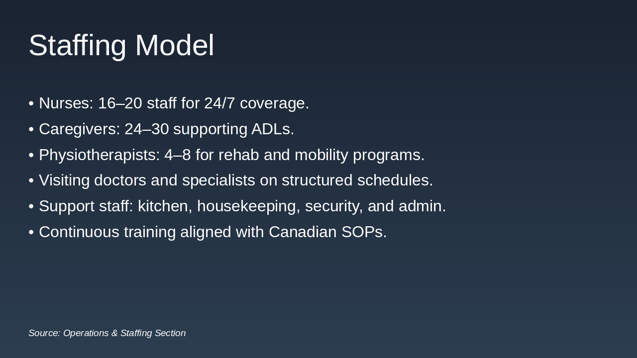- 24/7 nursing and trained caregivers with Canadian SOP-driven protocols.