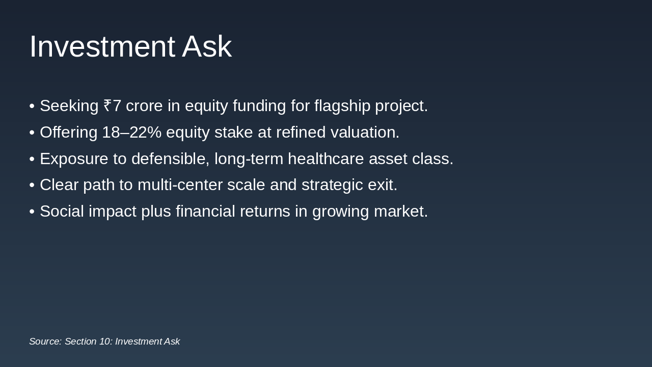 - Year 5: Reach 10–12 centers across India and prepare for larger institutional capital.