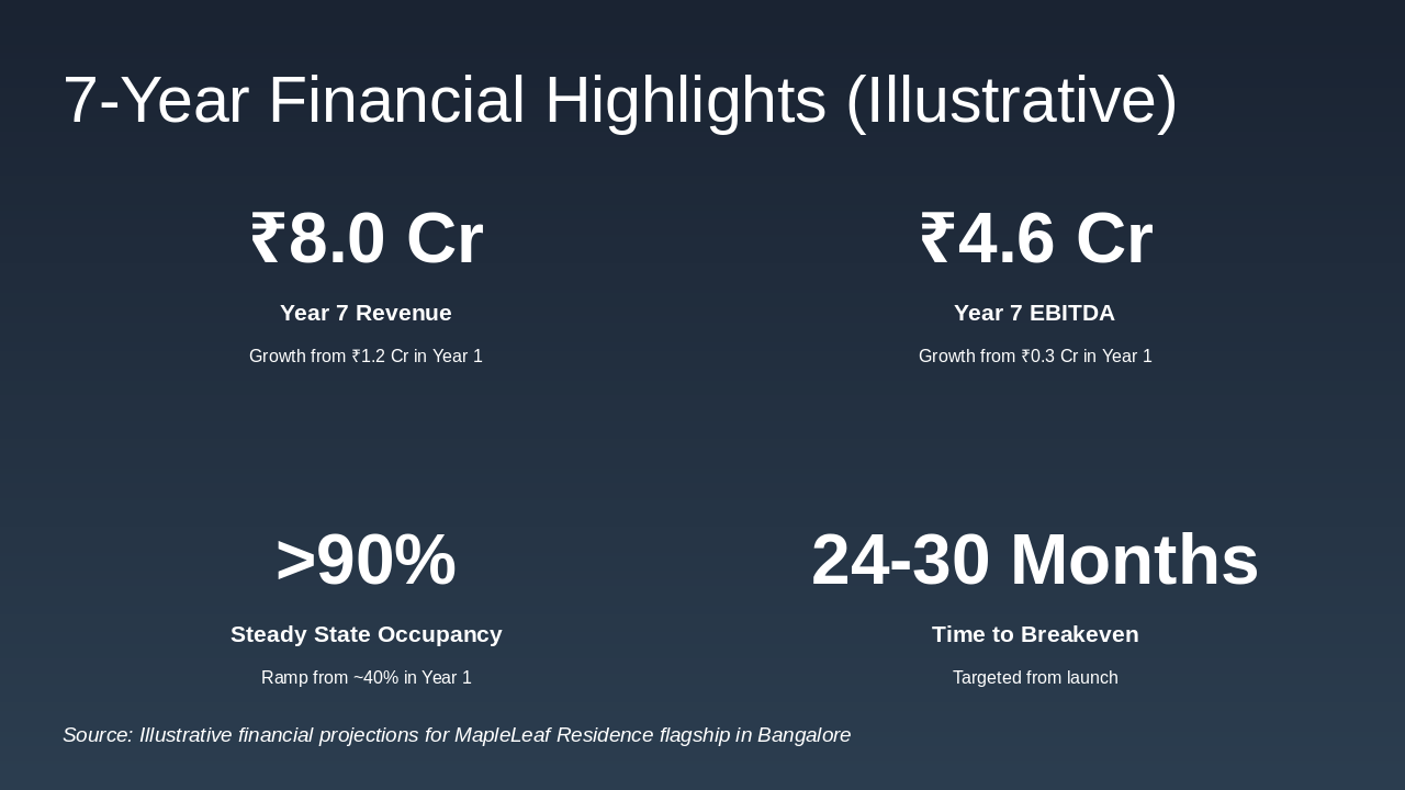 - Year 1–7 revenue growth: approx. ₹1.2 crore → ₹8.0 crore.