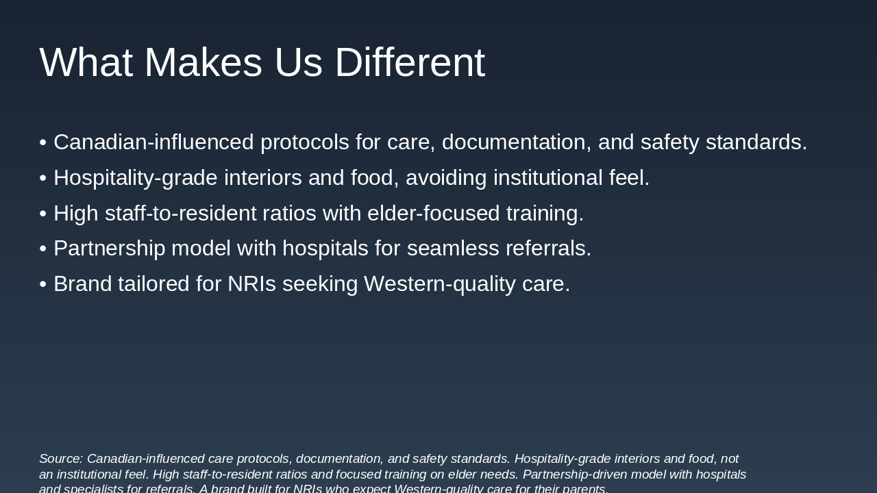 - Canadian-standard care with Indian warmth is a powerful, differentiated story.