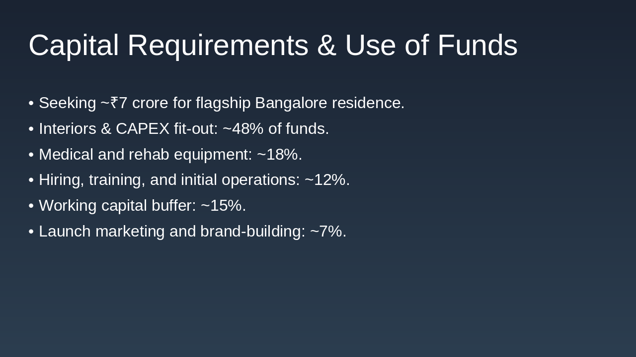 - Use of funds split across interiors, medical equipment, staffing, and launch.
