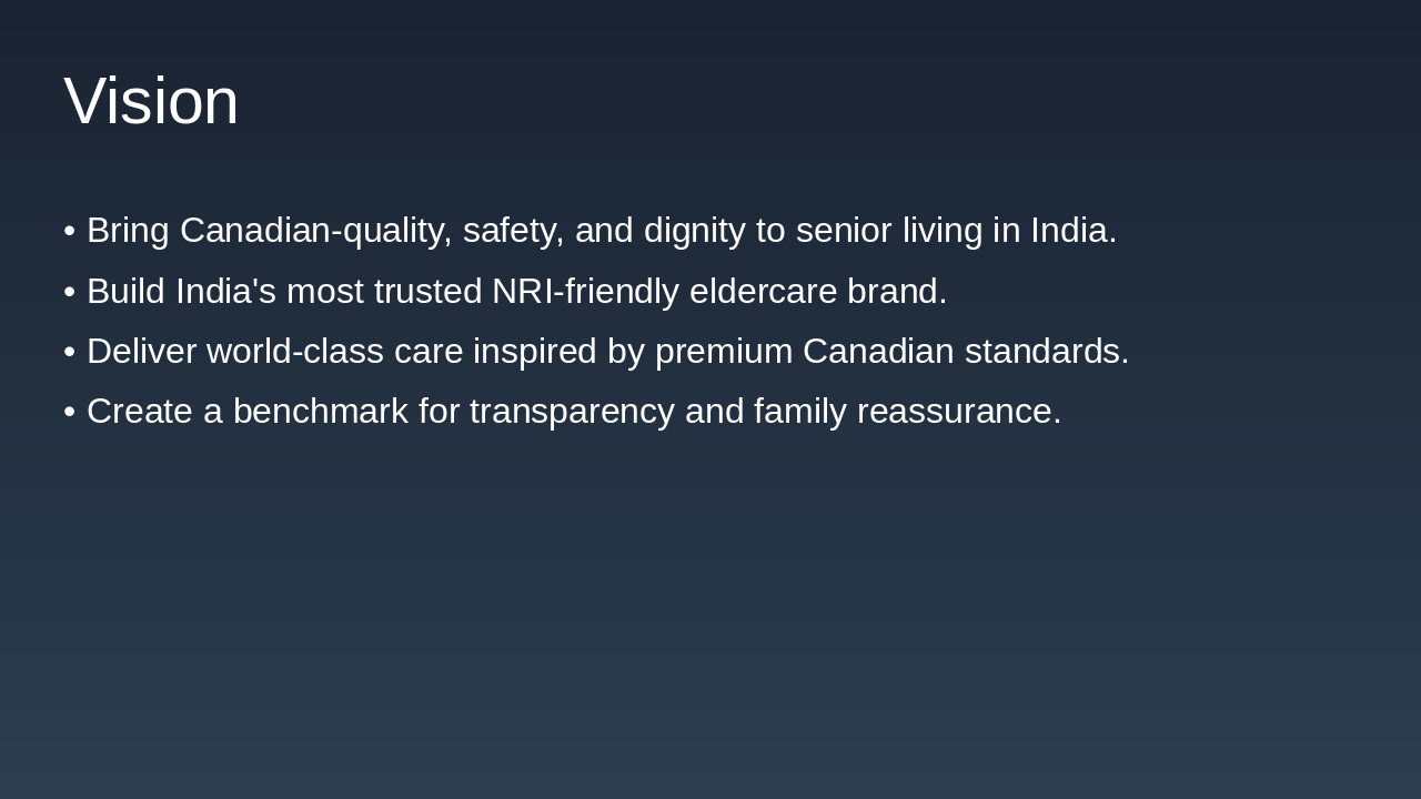 - To build India's most trusted NRI-friendly eldercare brand.
