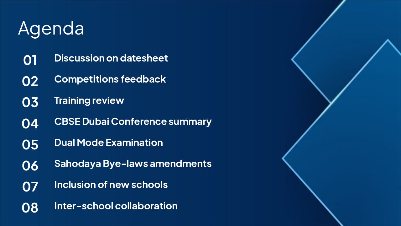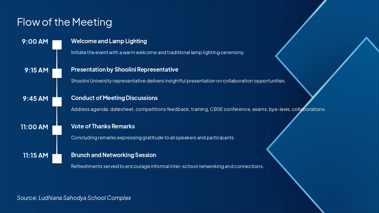 9:00 AM: Welcome and Lamp Lighting Initiate the event with a warm welcome and traditional lamp lighting ceremony. 9:15 AM: Presentation by Shoolini Representative Shoolini University representative delivers insightful presentation on collaboration opportunities. 9:45 AM: Conduct of Meeting Discussions Address agenda: datesheet, competitions feedback, training, CBSE conference, exams, bye-laws, collaborations. 11:00 AM: Vote of Thanks Remarks Concluding remarks expressing gratitude to all speakers and participants. 11:15 AM: Brunch and Networking Session Refreshments served to encourage informal inter-school networking and connections.
