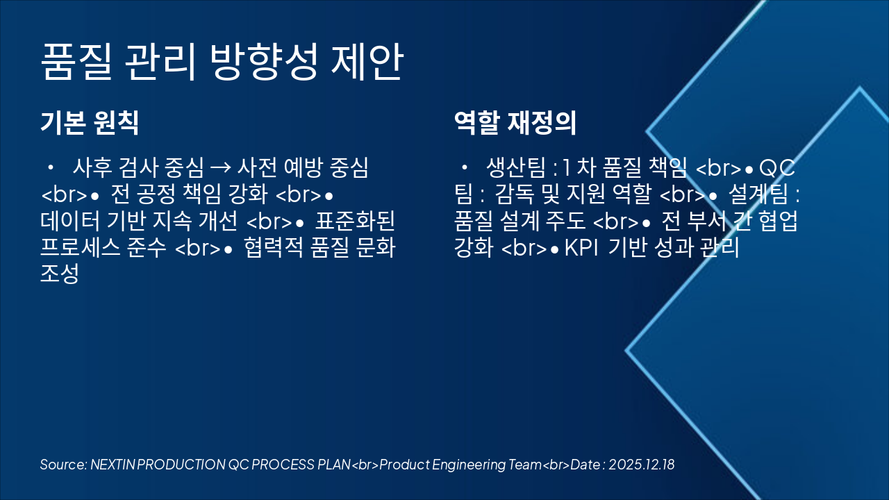 This title slide presents the "NEXTIN PRODUCTION QC PROCESS PLAN." The subtitle details a Production QC Establishment Proposal from the Product Engineering Team, dated 2025.12.18.