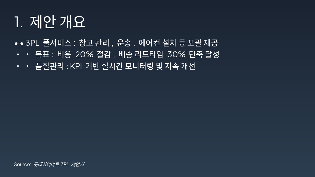 제안 개요는 3PL 풀서비스를 통해 창고 관리, 운송, 에어컨 설치 등을 포괄적으로 제공한다. 목표는 비용 20% 절감과 배송 리드타임 30% 단축이며, KPI 기반 실시간 모니터링으로 품질관리를 지속 개선한다.