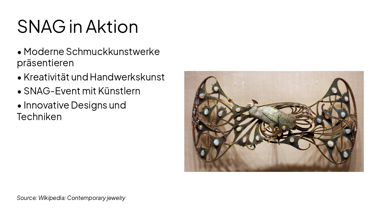 The title slide is titled "Sieraden: Tradition und Moderne," highlighting the blend of tradition and modernity in jewelry. Its subtitle describes a journey through North American goldsmithing art.