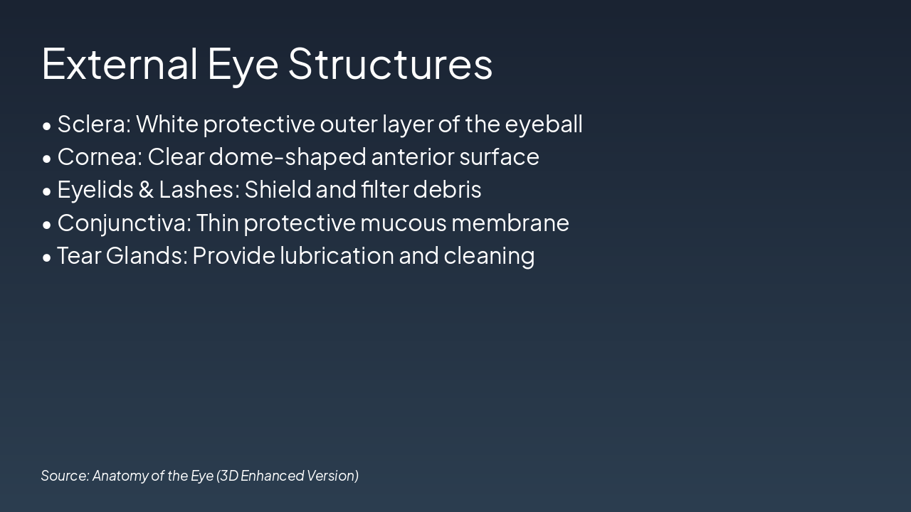 The slide outlines key external eye structures: the sclera as the white protective outer layer, the cornea as the clear dome-shaped anterior surface, eyelids and lashes that shield and filter debris, the conjunctiva as a thin protective mucous membrane, and tear glands that provide lubrication and cleaning. These components collectively protect, lubricate, and maintain the eye's surface.