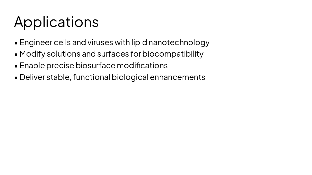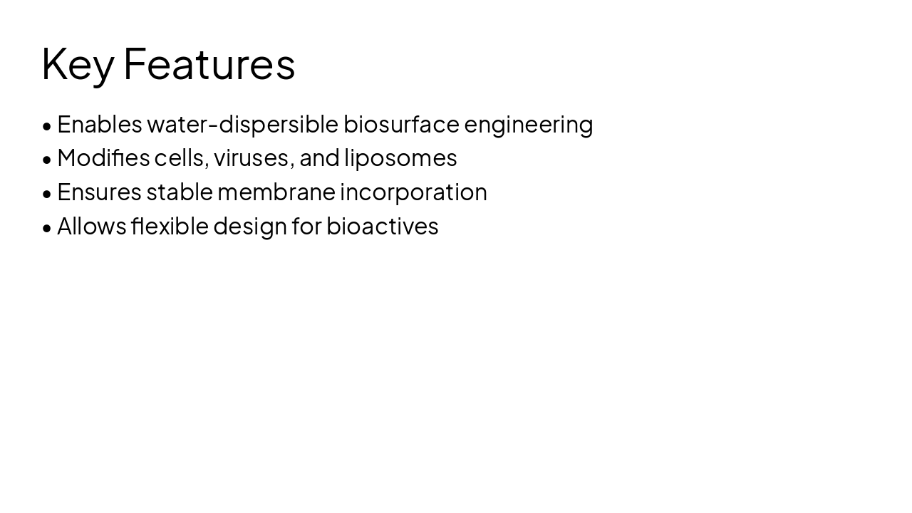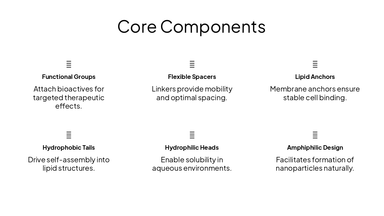 { "features": [ { "icon": "🧪", "heading": "Functional Groups", "description": "Attach bioactives for targeted therapeutic effects." }, { "icon": "🔗", "heading": "Flexible Spacers", "description": "Linkers provide mobility and optimal spacing." }, { "icon": "🧬", "heading": "Lipid Anchors", "description": "Membrane anchors ensure stable cell binding." }, { "icon": "💧", "heading": "Hydrophobic Tails", "description": "Drive self-assembly into lipid structures." }, { "icon": "🌊", "heading": "Hydrophilic Heads", "description": "Enable solubility in aqueous environments." }, { "icon": "🔄", "heading": "Amphiphilic Design", "description": "Facilitates formation of nanoparticles naturally." } ] }