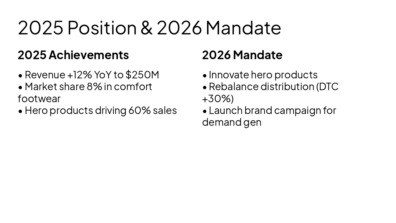 Executive board presentation outlining Rockport's 2025 achievements (revenue +12% to $250M, 8% market share) and 2026 mandate: innovate hero products in premium comfort footwear, rebalance distribution to 40% DTC, and launch brand campaign. Covers业务位