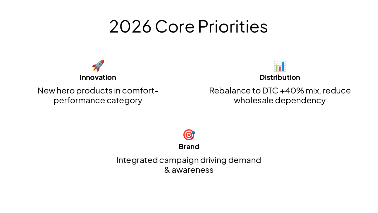 📊 Distribution Rebalance to DTC +40% mix, reduce wholesale dependency