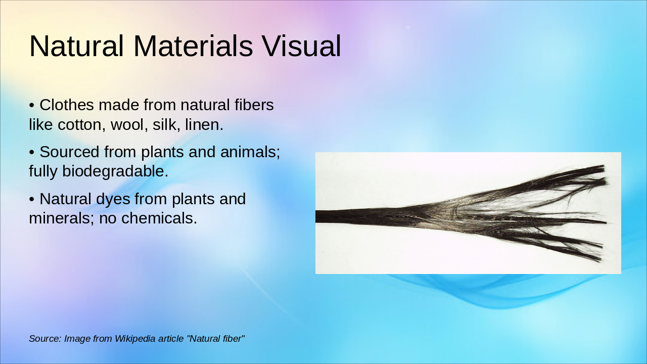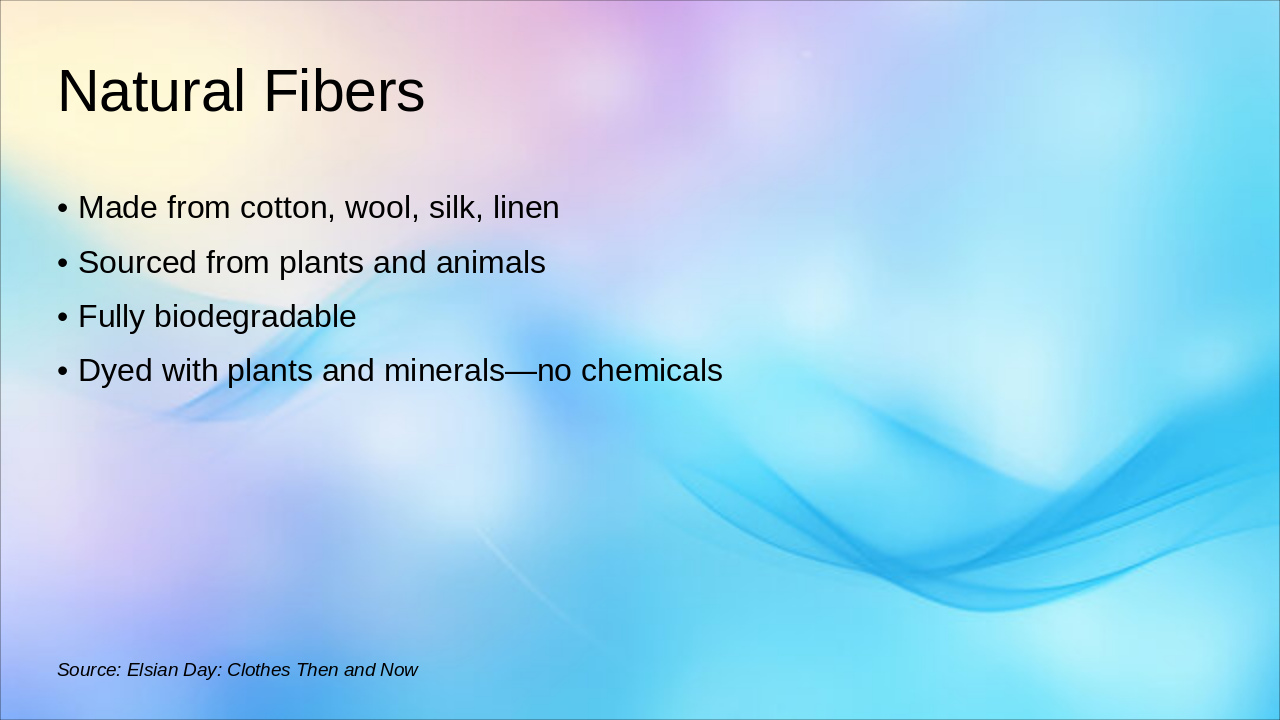 Natural fibers like cotton and wool from plants, animals; biodegradable.