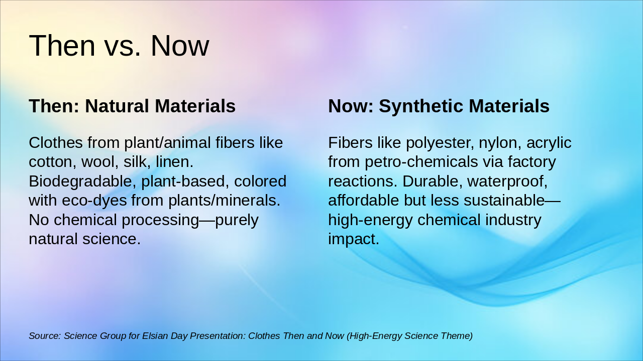 Summary, sustainable innovations ahead. Source: Science Group for Elsian Day Presentation: Clothes Then and Now (High-Energy Science Theme)