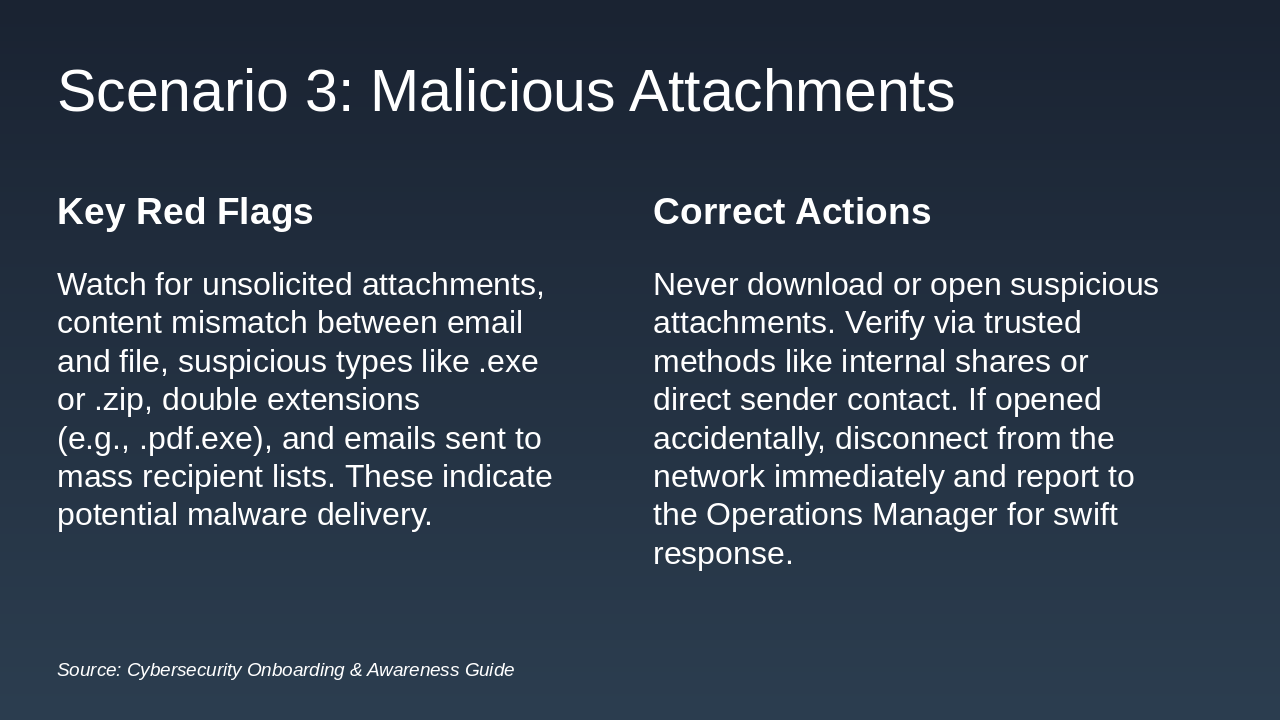 If Opened: If you accidentally open a suspicious attachment, immediately disconnect your device from the network (Wi-Fi/Ethernet) and contact the Operations Manager or IT support immediately.